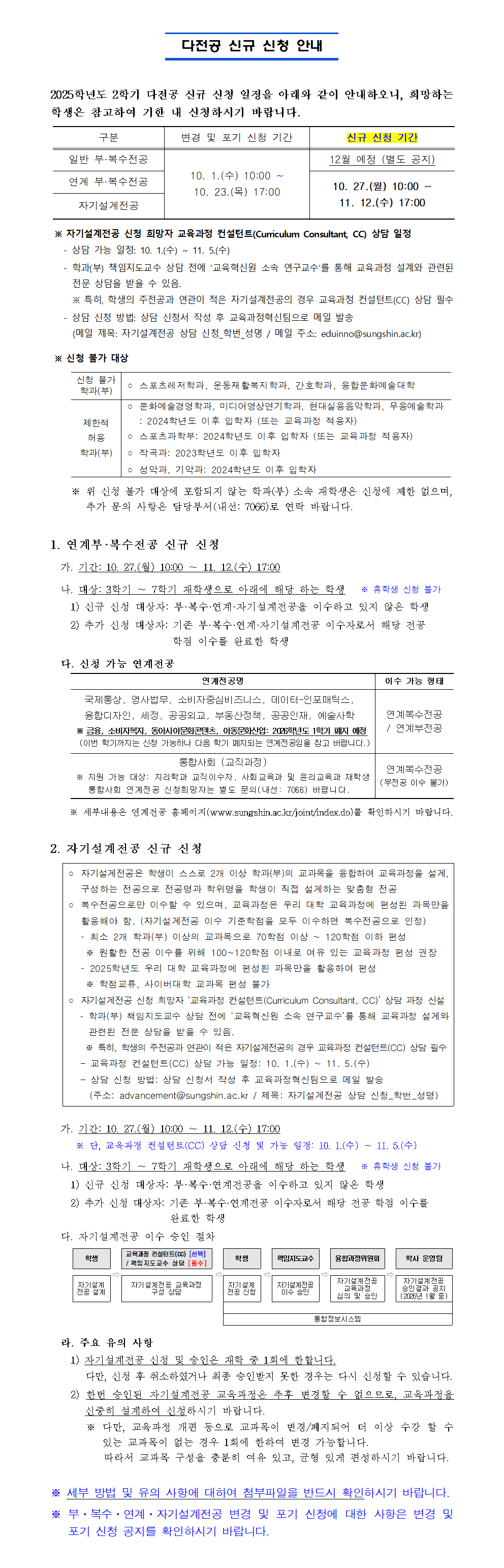 [교내 공지] 2025학년도 2학기 다전공(부·복수·연계·자기설계전공) 신규 신청 안내