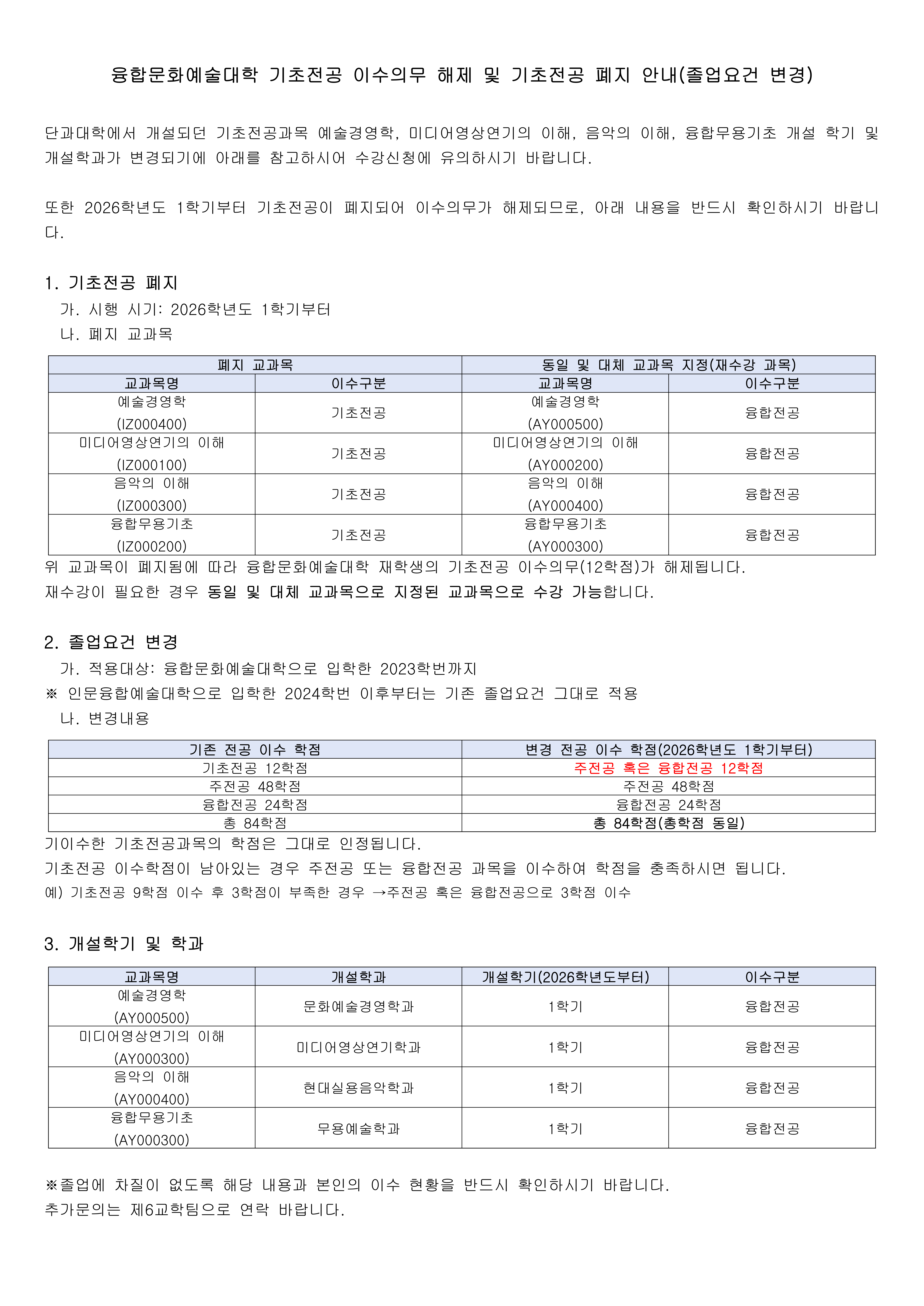 융합문화예술대학 기초전공 이수의무 해제 및 기초전공 폐지 안내
