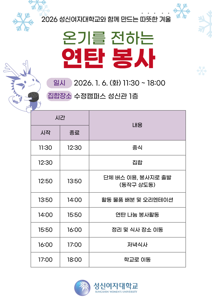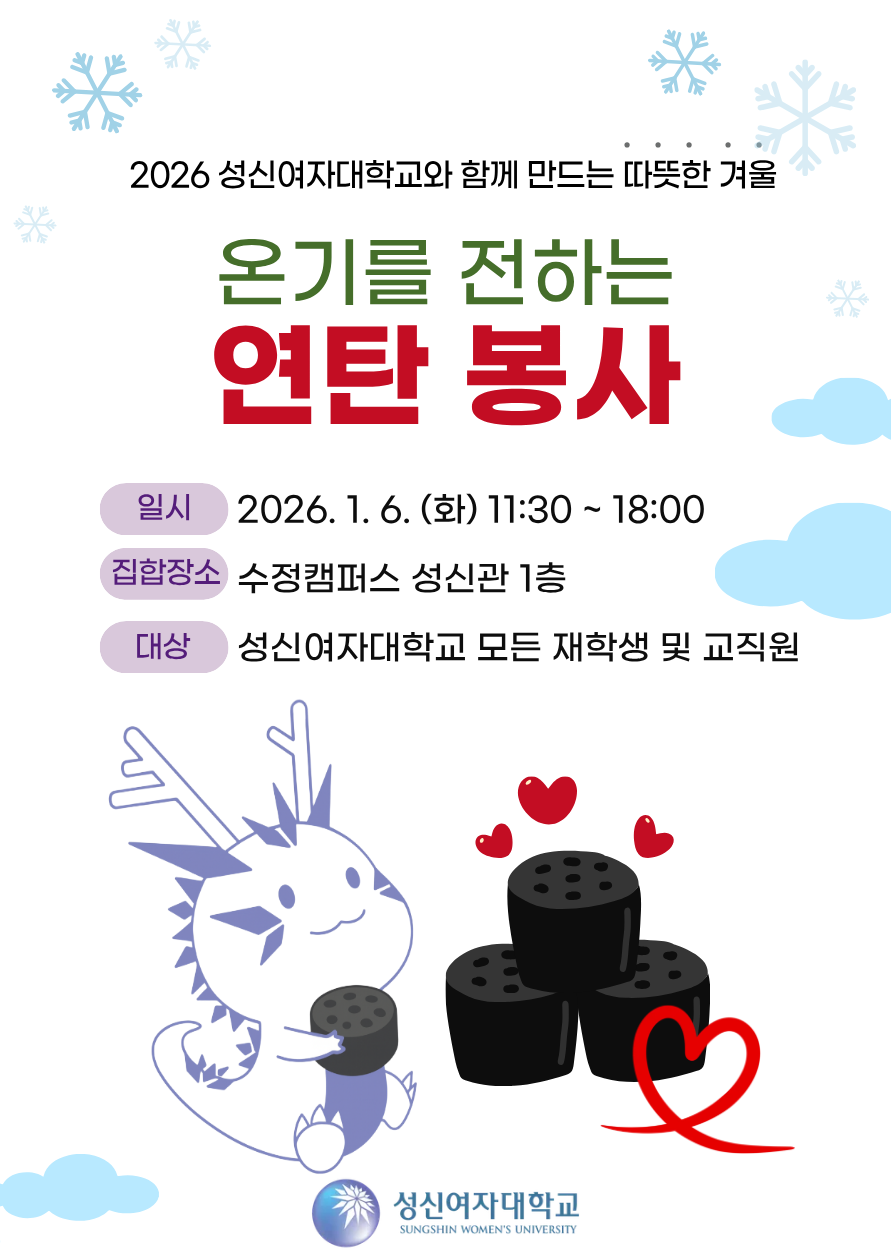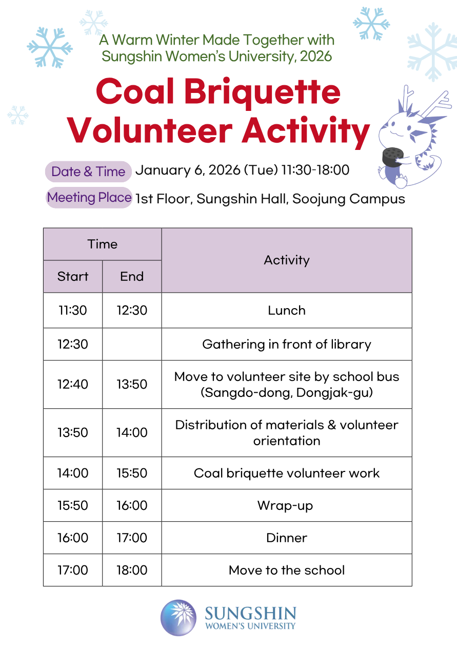 On January 6, we will be hosting a Coal Briquette Sharing Volunteer Activity to support vulnerable community members during the winter season and to strengthen the sense of community among Sungshin Women’s University members.