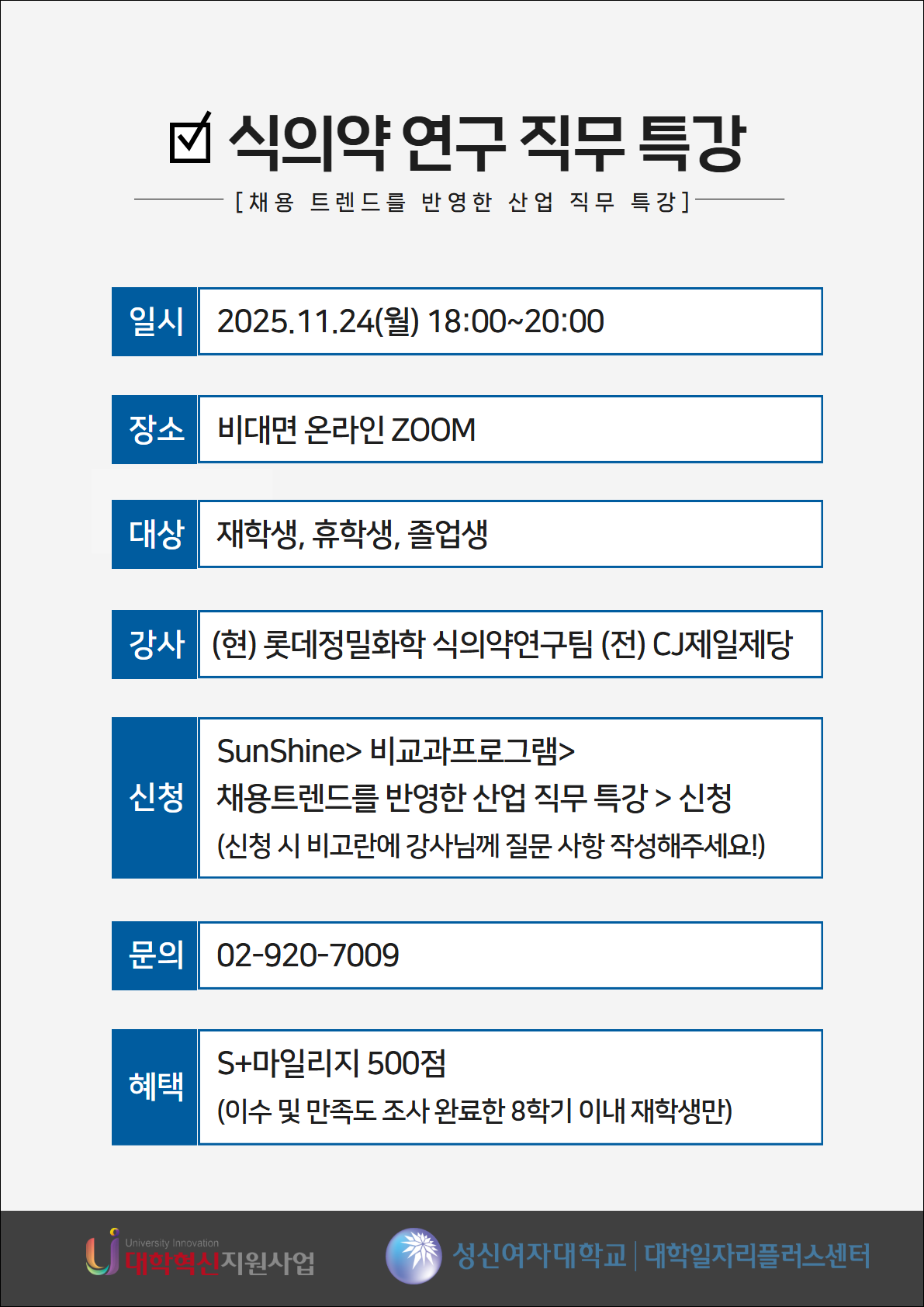 - 11/24(월) ZOOM, 식의약 연구 직무 특강