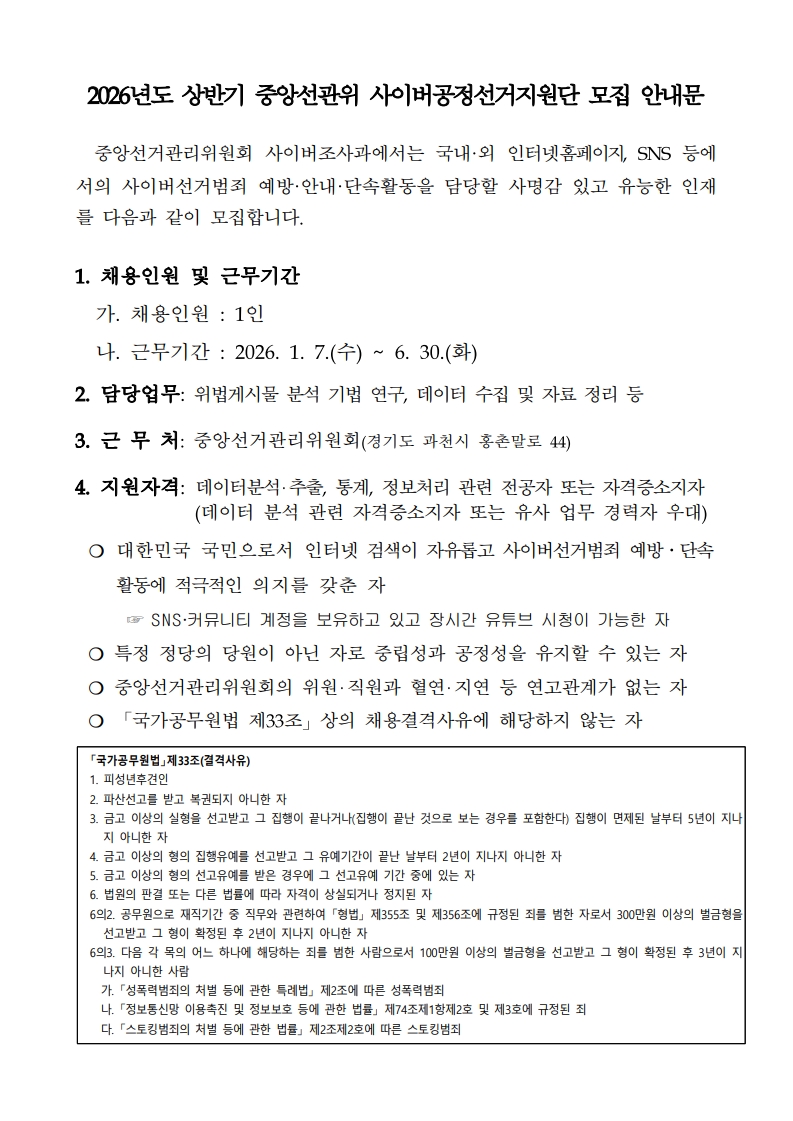 [대학일자리플러스센터] 중앙선거관리위원회 사이버공정선거지원단 모집안내문