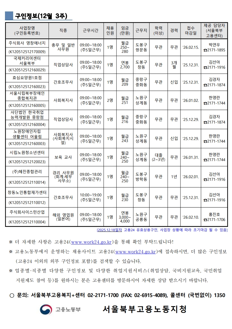 [대학일자리플러스센터] 서울북부고용복지센터 구인정보(12월 3주)