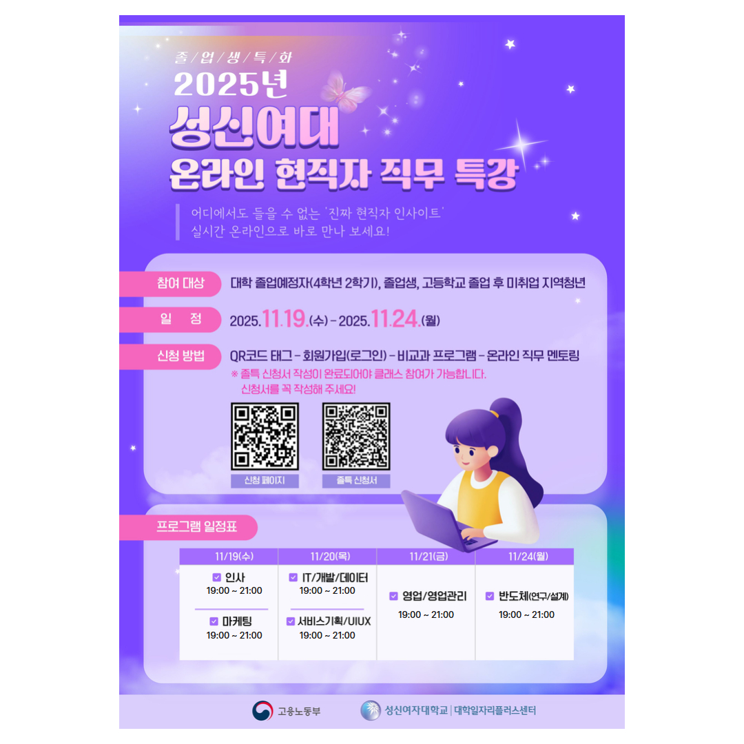 미취업 청년들의 많은 참여를 위해 온라인으로 진행되는 이번 과정은 성신여대 대학일자리플러스센터가 주관하고 직무 멘토링 플랫폼 잇다(itdaa)와 공동으로 운영된다. 참여 대상은 성신여대 졸업생을 포함한 지역 청년(19세~34세)이며 참여 신청 접수는 오는 16일까지 ‘2030지역청년 SunShine’ 사이트를 통해 진행한다. 졸업생의 경우, 고용노동부 ‘졸업생 특화 프로그램 사업’의 일환으로 진행되는 만큼 별도의 지정 신청서를 제출해야 참여가 가능하다.