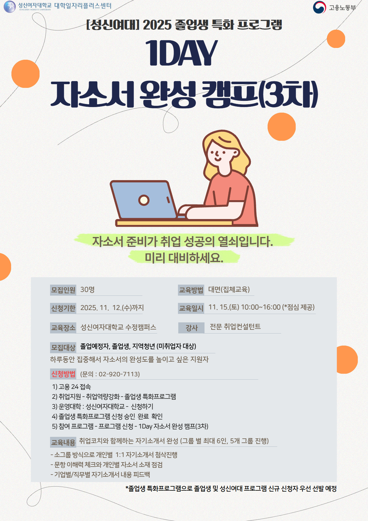 성신여대 대학일자리플러스센터 이채영 센터장은 “이번 캠프는 졸업을 앞두거나 졸업 후 취업을 준비하는 청년들이 자기소개서 작성의 어려움을 해소하고 실무 중심 컨설팅을 통해 자신감을 높일 수 있도록 기획됐다”며 “참가자들이 실제 채용 현장에서 통할 수 있는 자기소개서를 완성할 수 있도록 적극 지원하겠다”고 말했다.