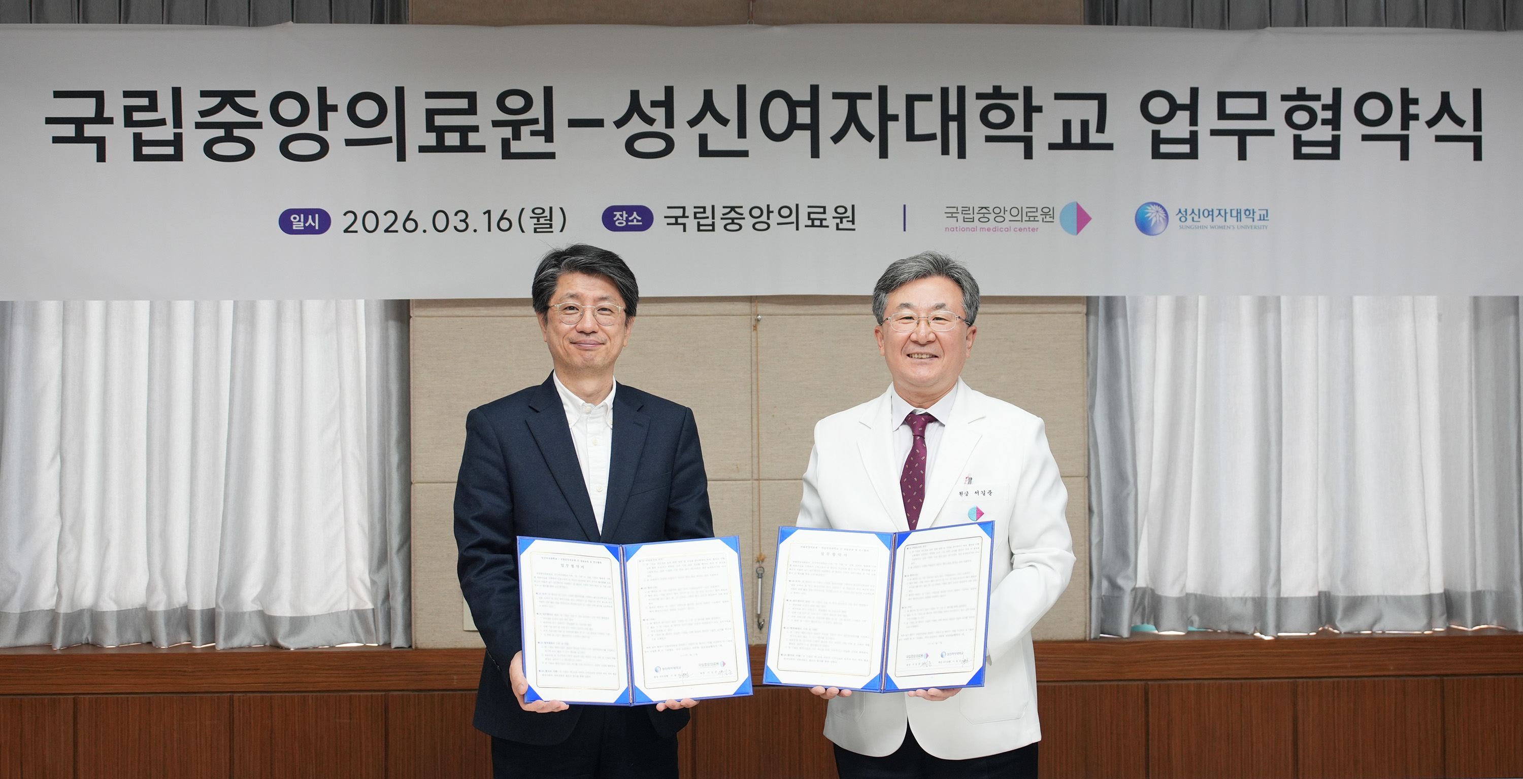 성신여대-국립중앙의료원 업무협약 체결 후 기념 촬영하고 있다. 이원호 총장직무대리(왼쪽), 서길준 국립의료원장(오른쪽)