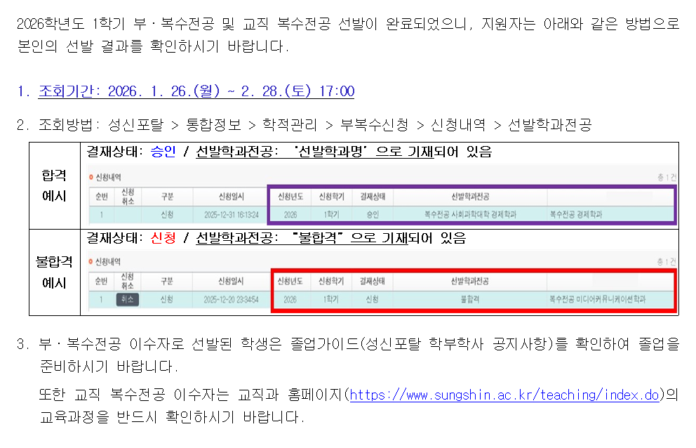 [학사운영팀]2026학년도 1학기 부·복수전공 및 교직 복수전공 합격자 발표 안내