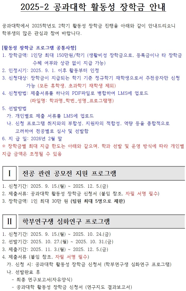 [교내 공지] 2025학년도 2학기 공과대학 활동성 장학금 신청 안내(25.10.21.수정)