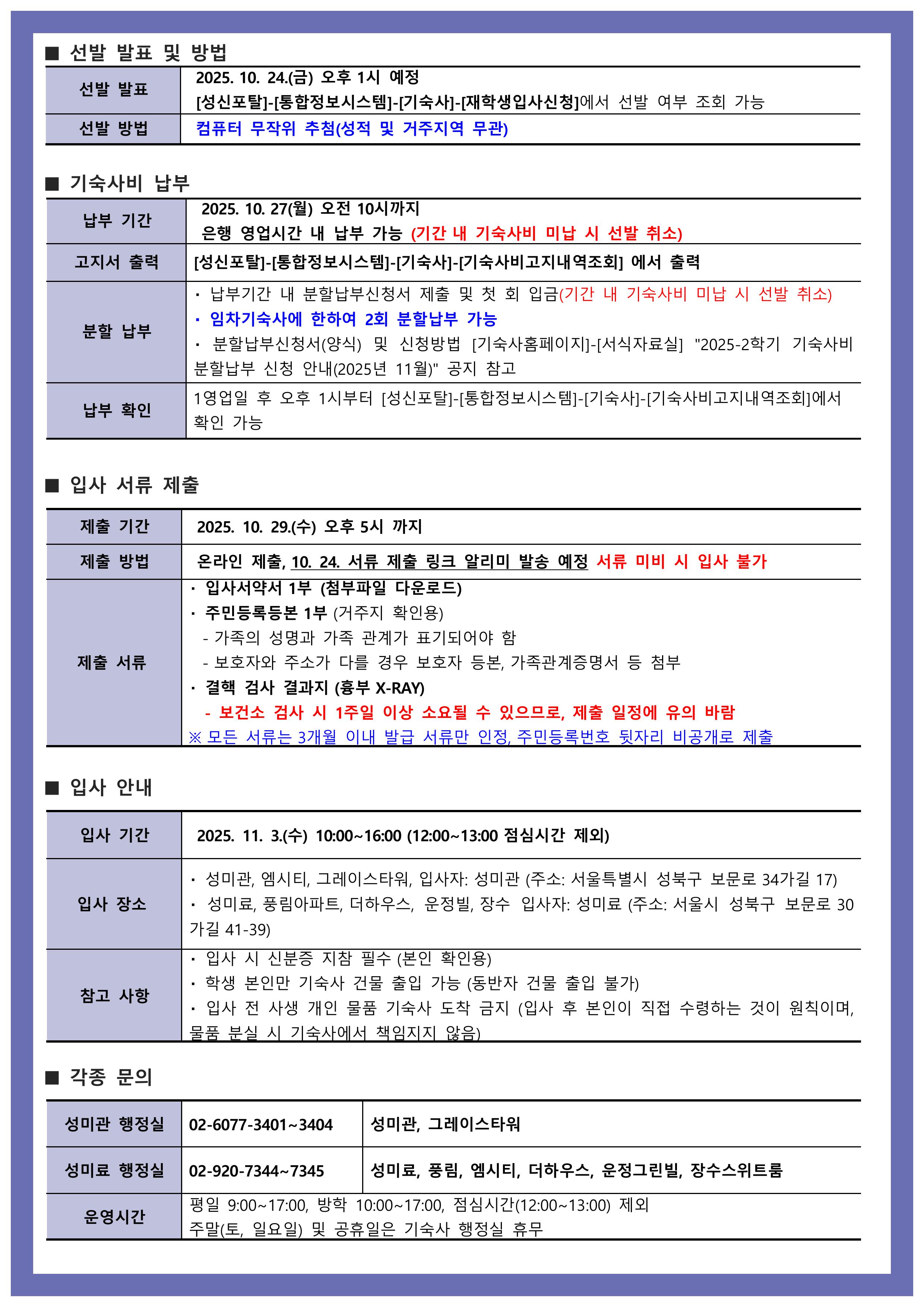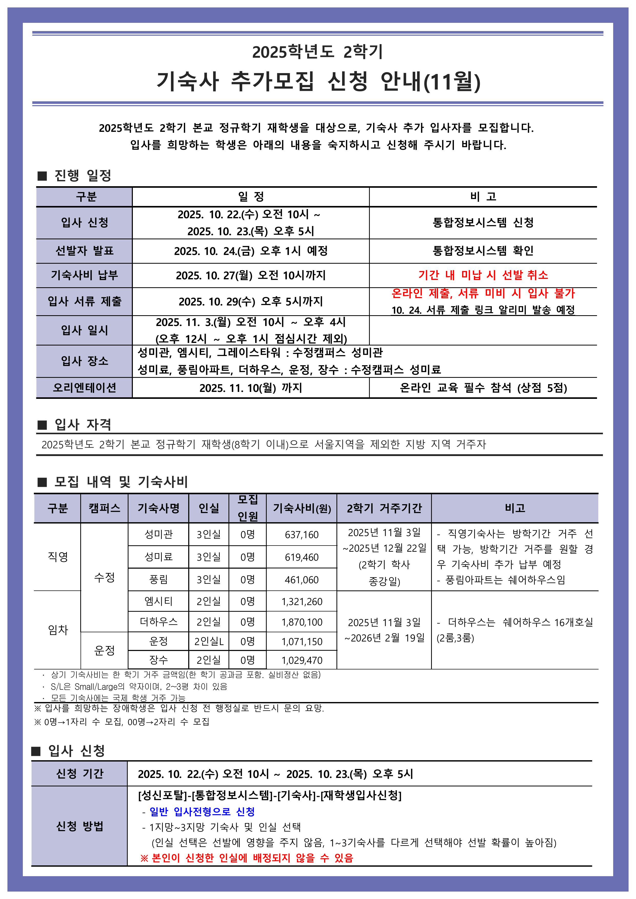 fnctId=bbs,fnctNo=4077 [입·퇴사] 2025학년도 2학기 기숙사 추가모집 신청 안내(11월 입사) 작성일 2025.10.16 수정일 2025.10.16 작성자 기숙사 조회수 259 글번호 147971 첨부파일 [양식] 기숙사 입사서약서_2025.hwp 미리보기