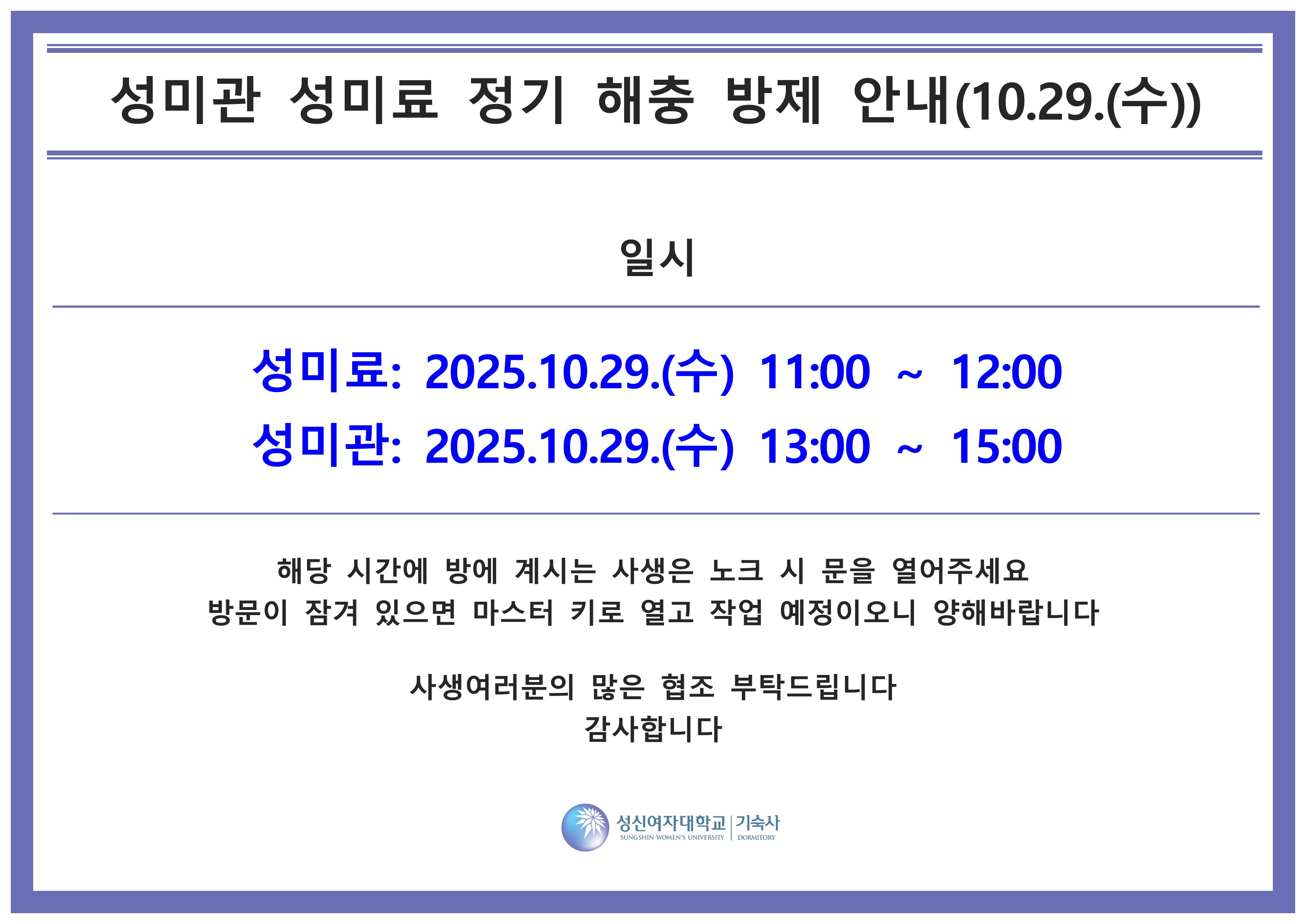 fnctId=bbs,fnctNo=4077 [시설] [성미관/성미료] 정기 해충 방제 안내(10.29.(수)) 작성일 2025.10.22 수정일 2025.10.22 작성자 기숙사 조회수 26 글번호 148157 첨부파일 첨부파일이(가) 없습니다.