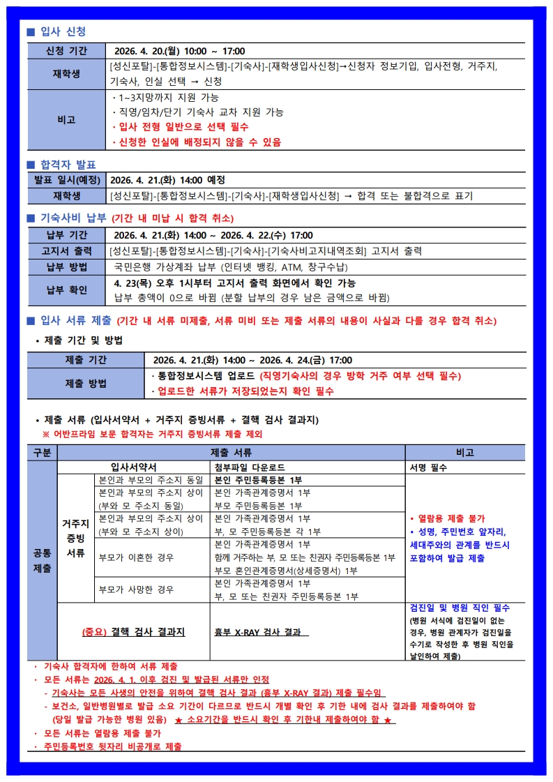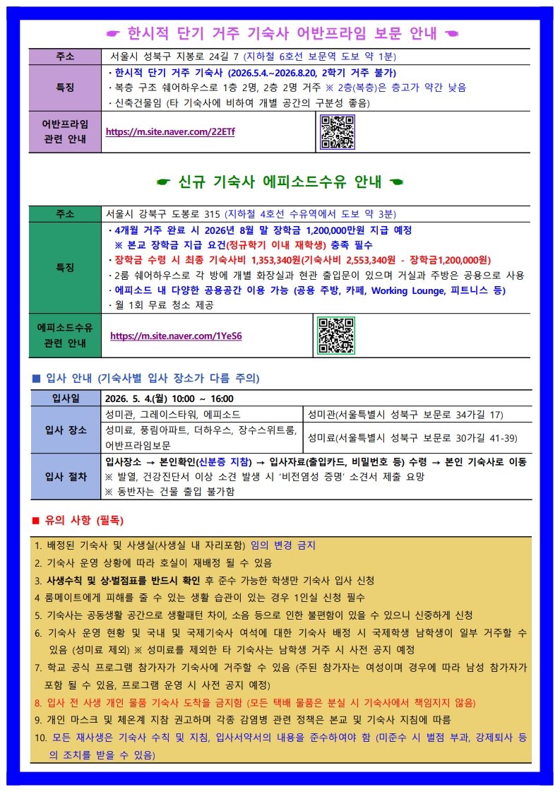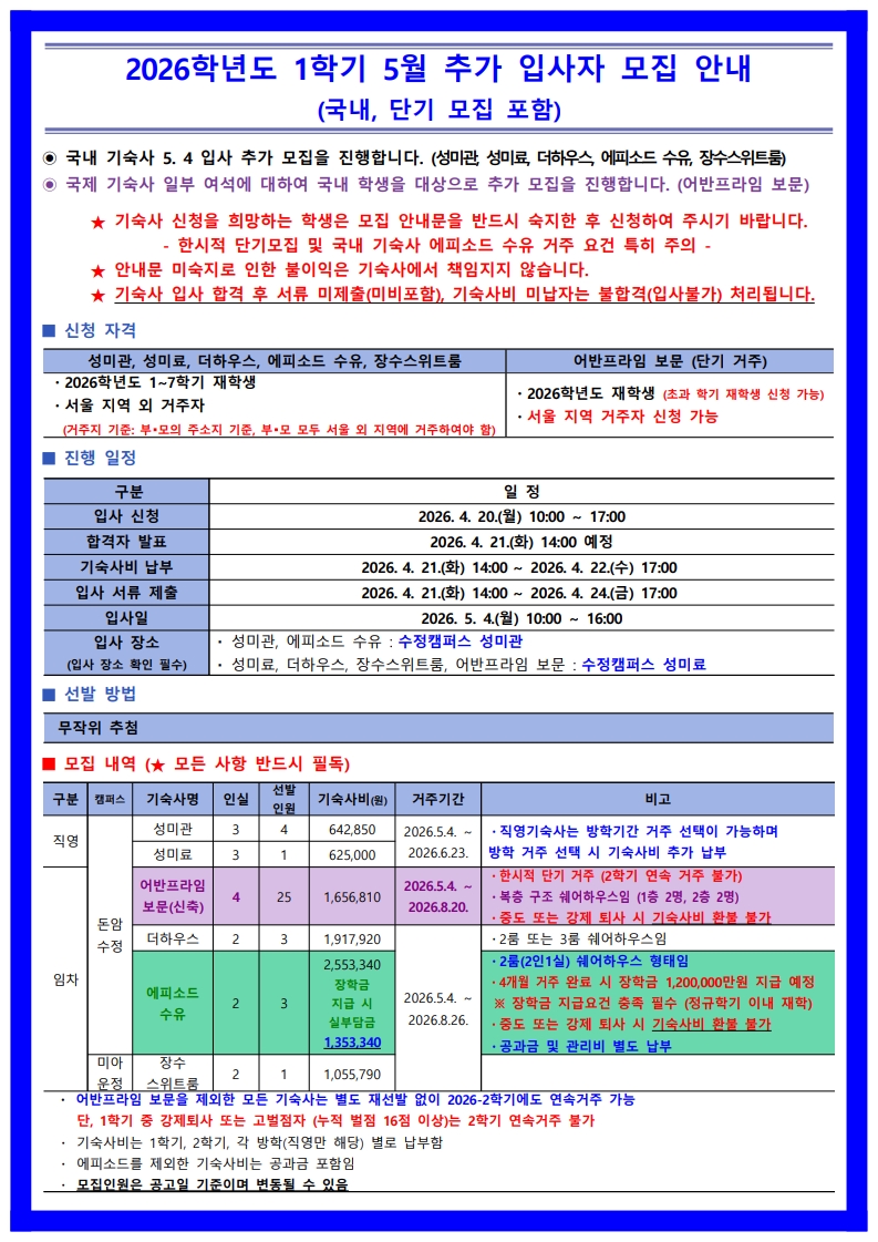 fnctId=bbs,fnctNo=4077 [입·퇴사] 2026-1학기 5월 추가 입사자 모집 안내(국내, 단기 모집 포함) 작성일 2026.04.09 수정일 2026.04.10 작성자 기숙사 조회수 718 글번호 154044 첨부파일 2026학년도_1학기_5월_기숙사_추가모집_시행_안내(국내,_단기_모집_포함).pdf 미리보기 기숙사 추가 입사 신청 및 서류 제출 방법 안내.pdf 미리보기 기숙사 입사서약서_2026.hwp 미리보기