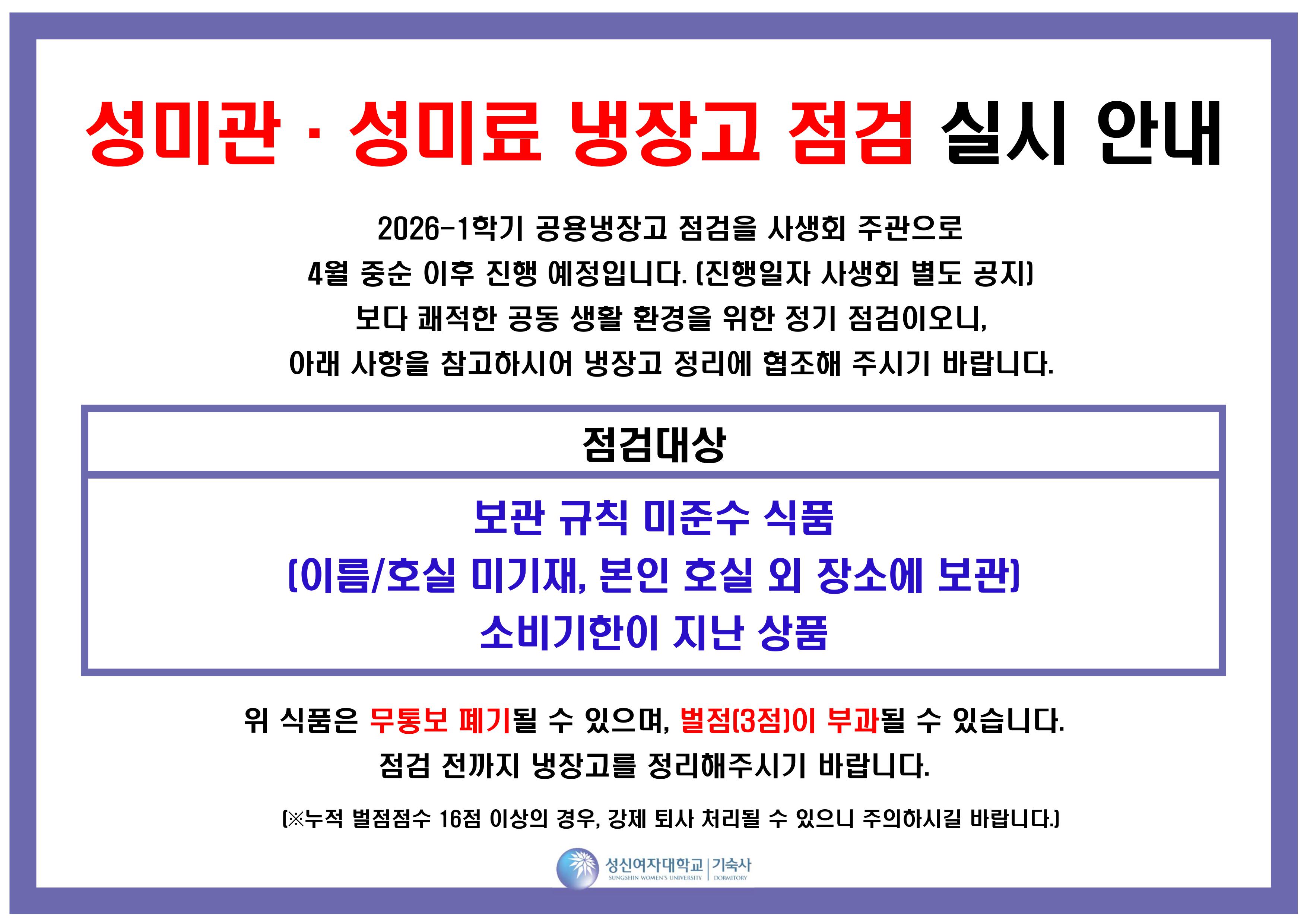 fnctId=bbs,fnctNo=4077 [일반] 성미관·성미료 냉장고 점검 실시 안내 작성일 2026.04.10 수정일 2026.04.10 작성자 기숙사 조회수 96 글번호 154061 첨부파일 첨부파일이(가) 없습니다.