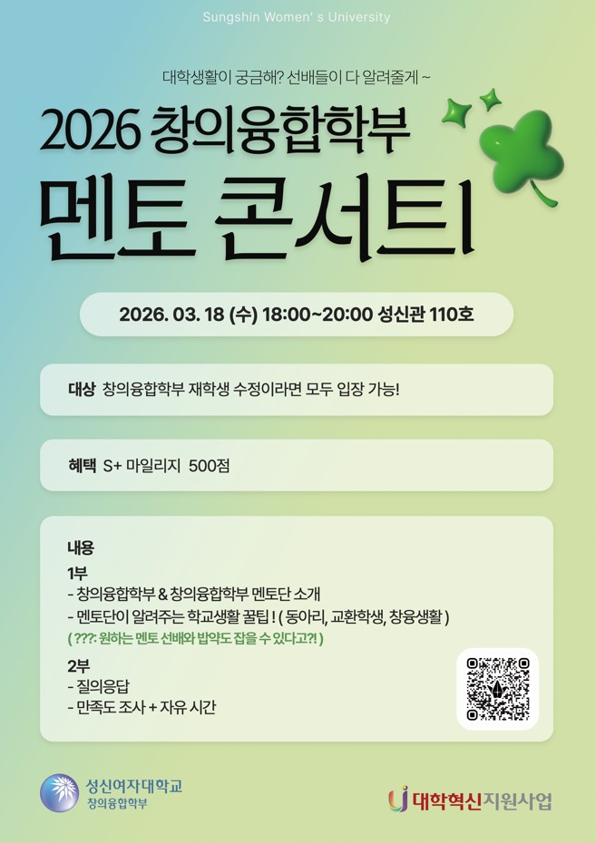 [창의융합학부] [대학혁신(2026)] 2026학년도 창의융합학부 멘토 콘서트Ⅰ 신청 안내