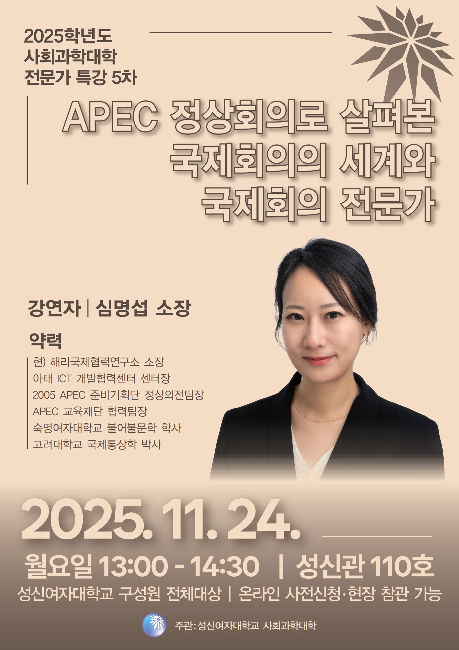 [행사] 2025학년도 사회과학대학 전문가 특강 5차 <APEC 정상회의로 살펴본 국제회의의 세계와 국제회의 전문가> 안내