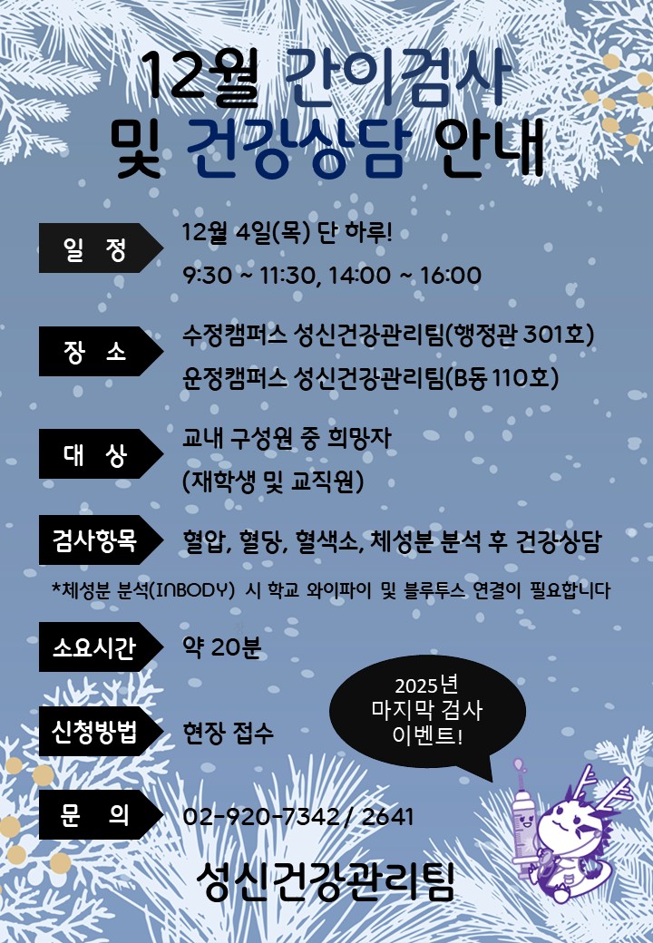 ※장학공지는 성신포탈 로그인 후 ‘공지→학부장학’에서 확인하세요. (대학원은 각 대학원 홈페이지에서 확인) fnctId=bbs,fnctNo=3181 [성신건강관리팀] 12월 간이검사 및 건강상담 행사 작성일 2025.12.01 수정일 2025.12.02 작성자 성신건강관리팀 조회수 261 글번호 149427 첨부파일 첨부파일이(가) 없습니다.