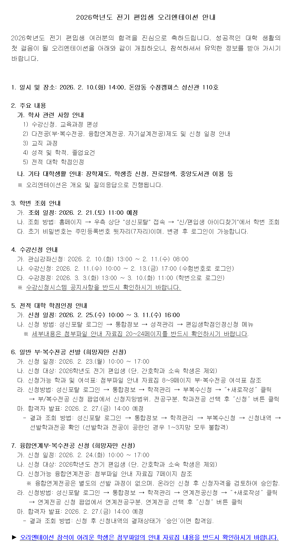 ※장학공지는 성신포탈 로그인 후 ‘공지→학부장학’에서 확인하세요. (대학원은 각 대학원 홈페이지에서 확인) fnctId=bbs,fnctNo=3181 2026학년도 전기 편입생 오리엔테이션 개최 안내 작성일 2026.02.06 수정일 2026.02.07 작성자 학사운영팀 조회수 2416 글번호 151536 첨부파일 ★2026학년도 편입생 안내 자료집.pdf 미리보기