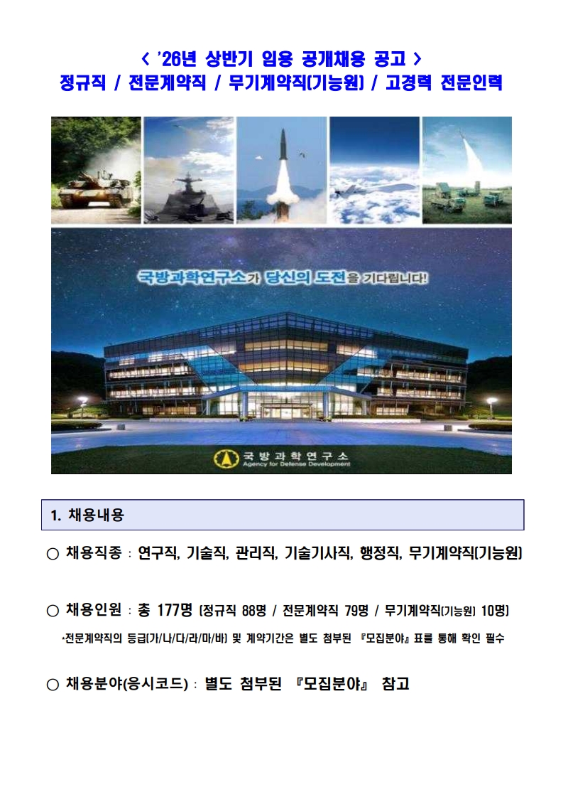 ※장학공지는 성신포탈 로그인 후 ‘공지→학부장학’에서 확인하세요. (대학원은 각 대학원 홈페이지에서 확인) fnctId=bbs,fnctNo=3183 [대학일자리플러스센터] 국방과학연구소 26년 상반기 공개채용 공고 작성일 2025.11.12 수정일 2025.11.12 작성자 대학일자리플러스센터 조회수 76 글번호 148815 첨부파일 [국방과학연구소] 26년 상반기 공개채용 공고.pdf 미리보기 [붙임] 국방과학연구소 세부사항 및 제출서류.zip