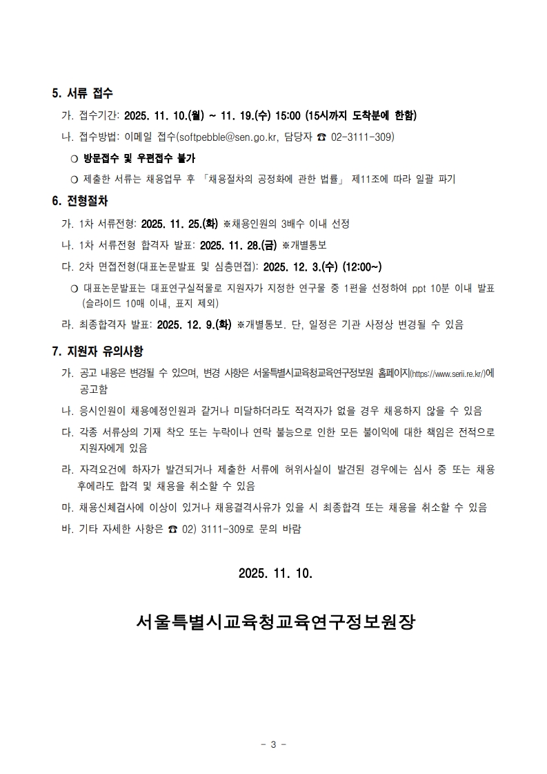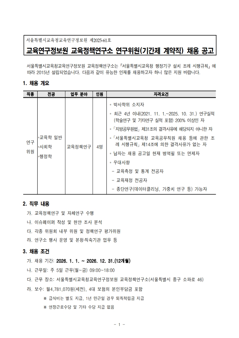 ※장학공지는 성신포탈 로그인 후 ‘공지→학부장학’에서 확인하세요. (대학원은 각 대학원 홈페이지에서 확인) fnctId=bbs,fnctNo=3183 [대학일자리플러스센터] 서울교육정책연구소 연구위원(기간제 계약직) 채용 공고 작성일 2025.11.12 수정일 2025.11.12 작성자 대학일자리플러스센터 조회수 69 글번호 148813 첨부파일 [붙임1] 서울교육정책연구소 연구위원(기간제 계약직) 제출서식.hwp 미리보기