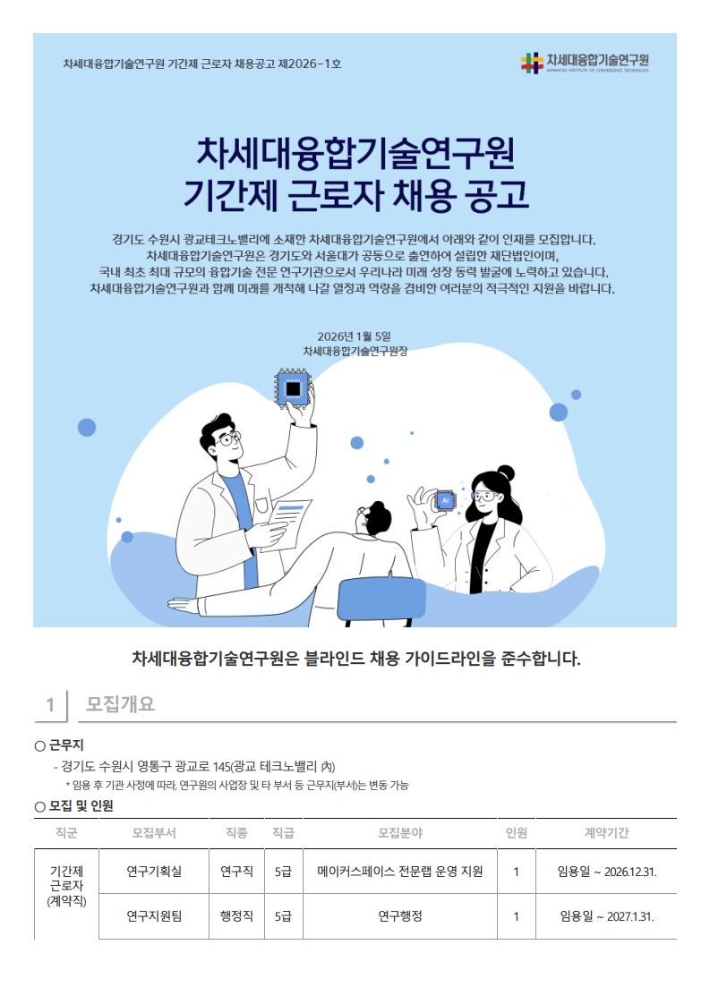 ※장학공지는 성신포탈 로그인 후 ‘공지→학부장학’에서 확인하세요. (대학원은 각 대학원 홈페이지에서 확인) fnctId=bbs,fnctNo=3183 [대학일자리플러스센터] 차세대융합기술연구원 기간제 근로자 채용 공고 작성일 2026.01.13 수정일 2026.01.13 작성자 대학일자리플러스센터 조회수 113 글번호 150695 첨부파일 [차세대융합기술연구원] 기간제 근로자 채용 공고.pdf 미리보기