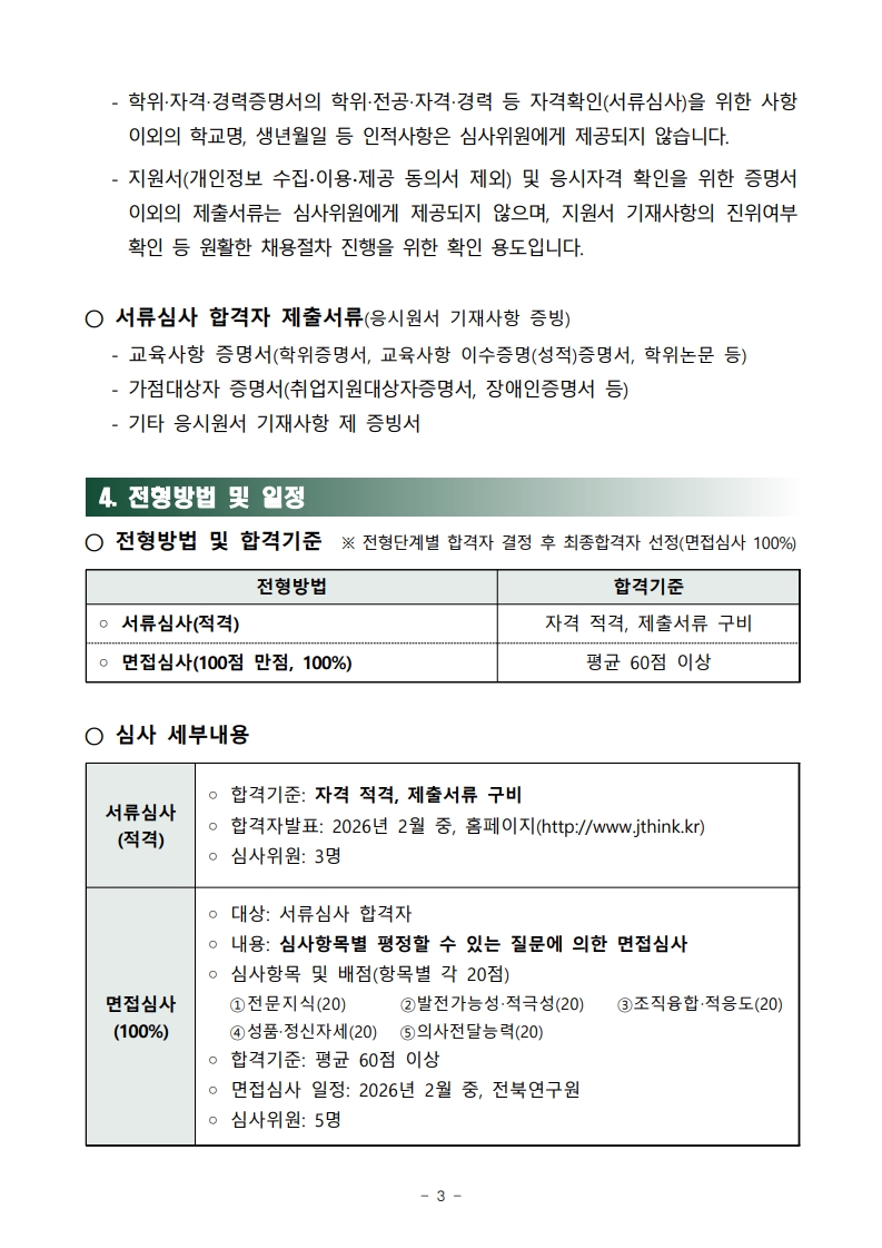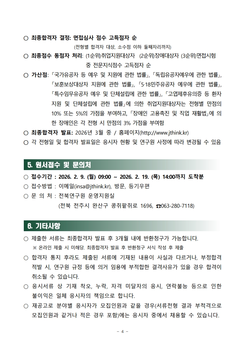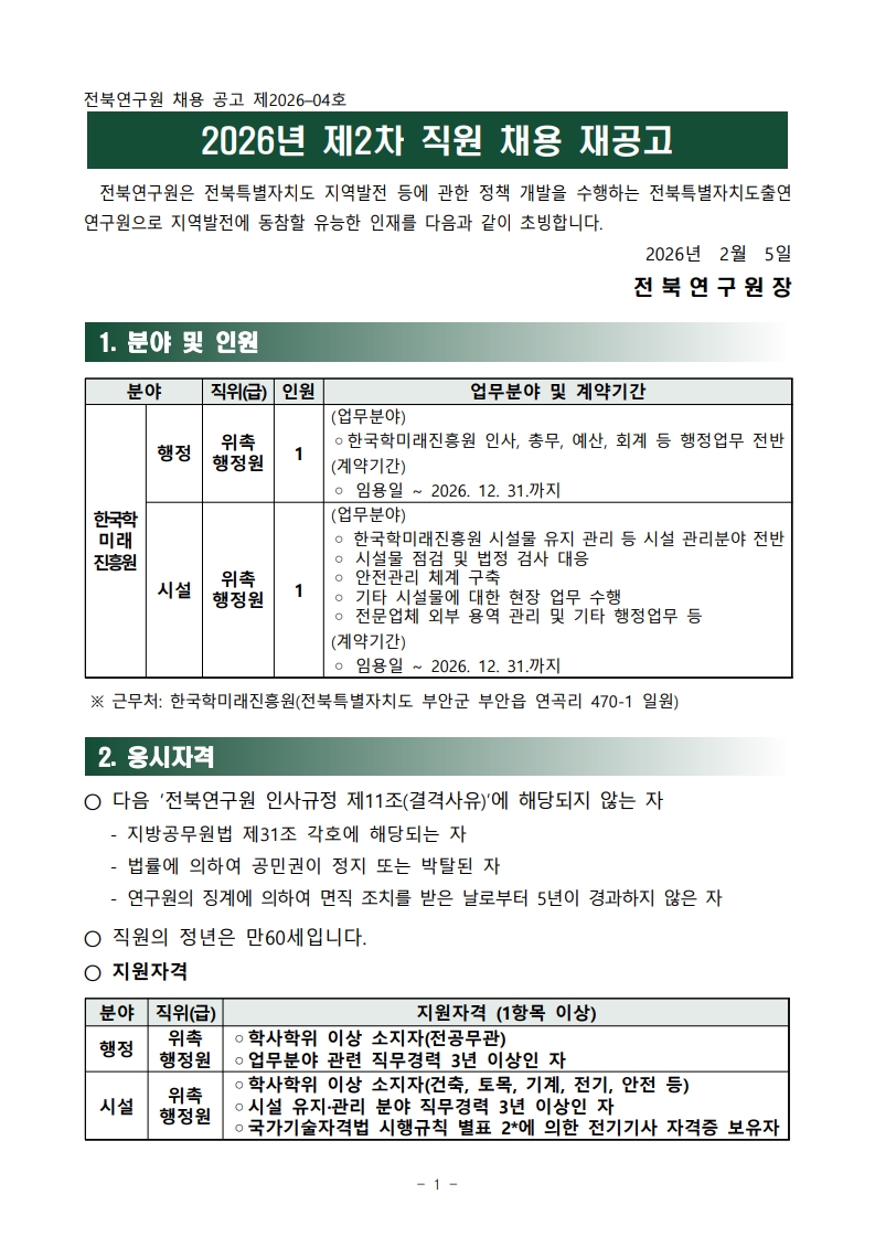※장학공지는 성신포탈 로그인 후 ‘공지→학부장학’에서 확인하세요. (대학원은 각 대학원 홈페이지에서 확인) fnctId=bbs,fnctNo=3183 [대학일자리플러스센터] 전북연구원 2026년 제2차 직원 채용 공고 작성일 2026.02.09 수정일 2026.02.09 작성자 대학일자리플러스센터 조회수 48 글번호 151579 첨부파일 [전북연구원] 2026년 제2차 직원 채용 공고.pdf 미리보기 [붙임1] 전북연구원 지원서.hwp 미리보기