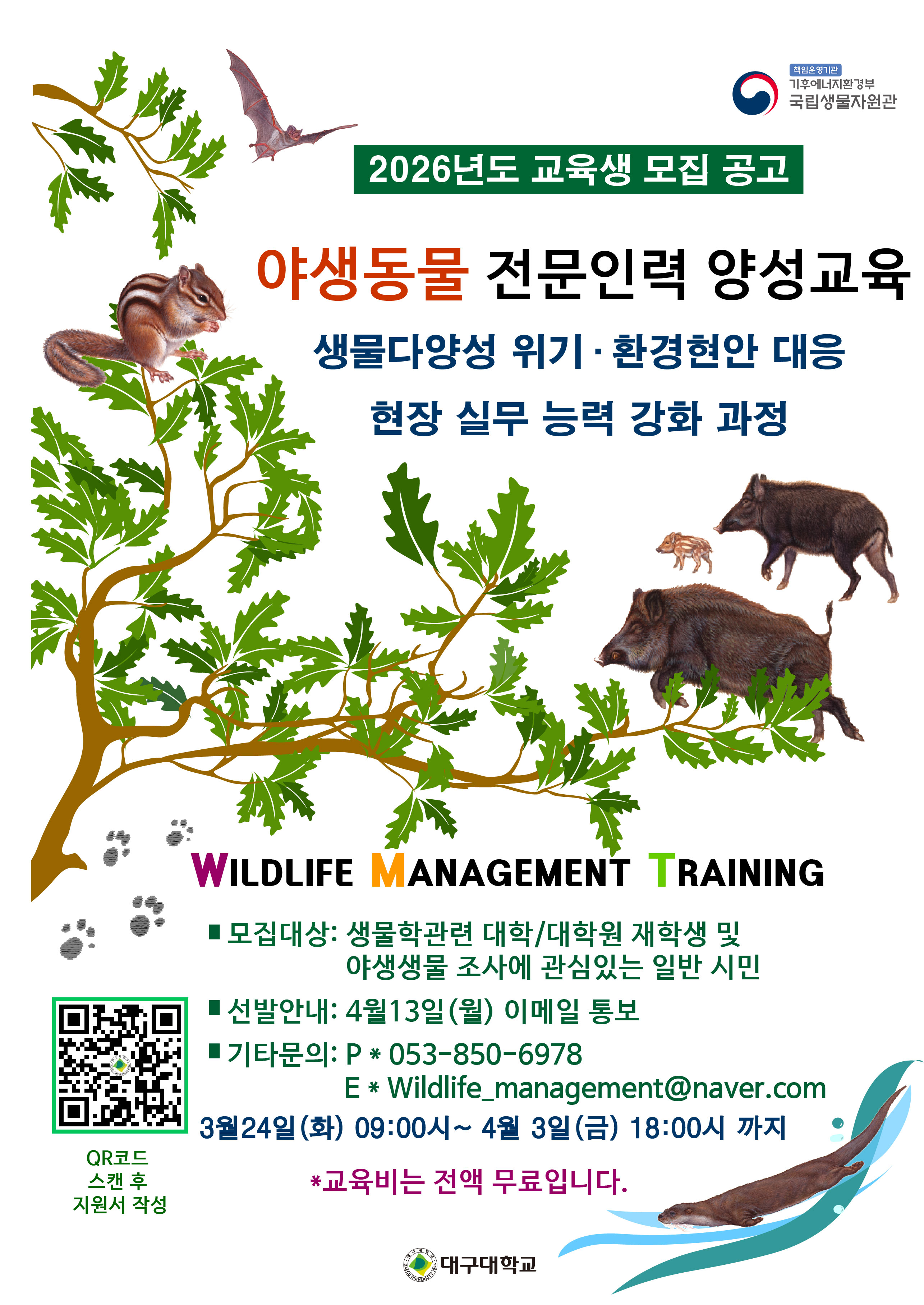 [국립생물자원관] 생물다양성 정책지원 현장실무 인력양성(2026년) 야생동물 교육과정 교육생 모집 안내