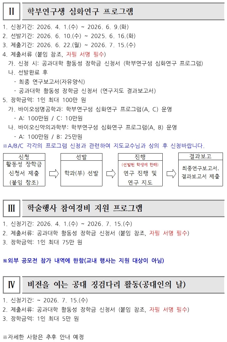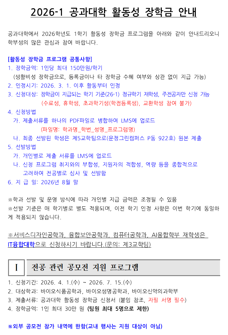 [공과대학] 2026학년도 1학기 공과대학 활동성장학금 안내