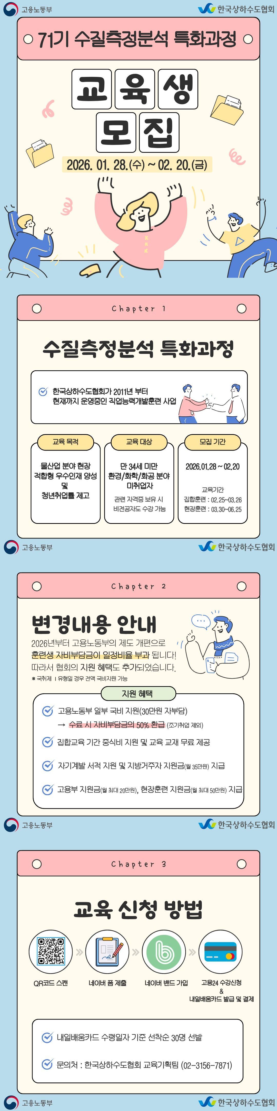 - 교 육: 수질측정분석 집체 이론교육(2.25~3.26) + 현장실습(3.30~6.25)