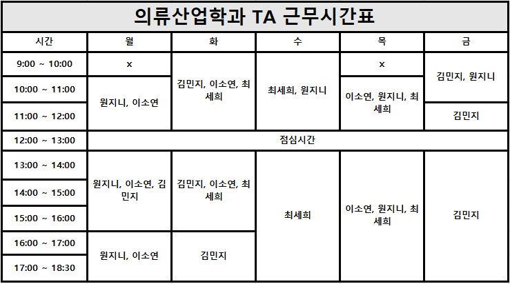 1. 운영시간: 월, 목 오전 10시 ~ 오후 6시 30분 (12:00~1:00 점심시간)