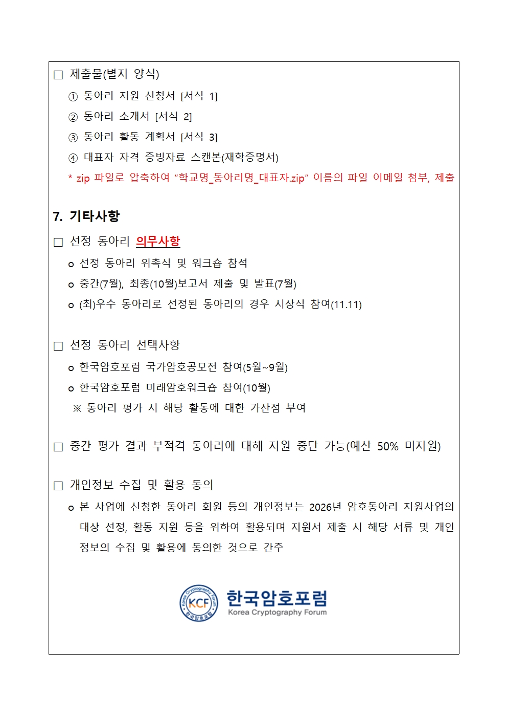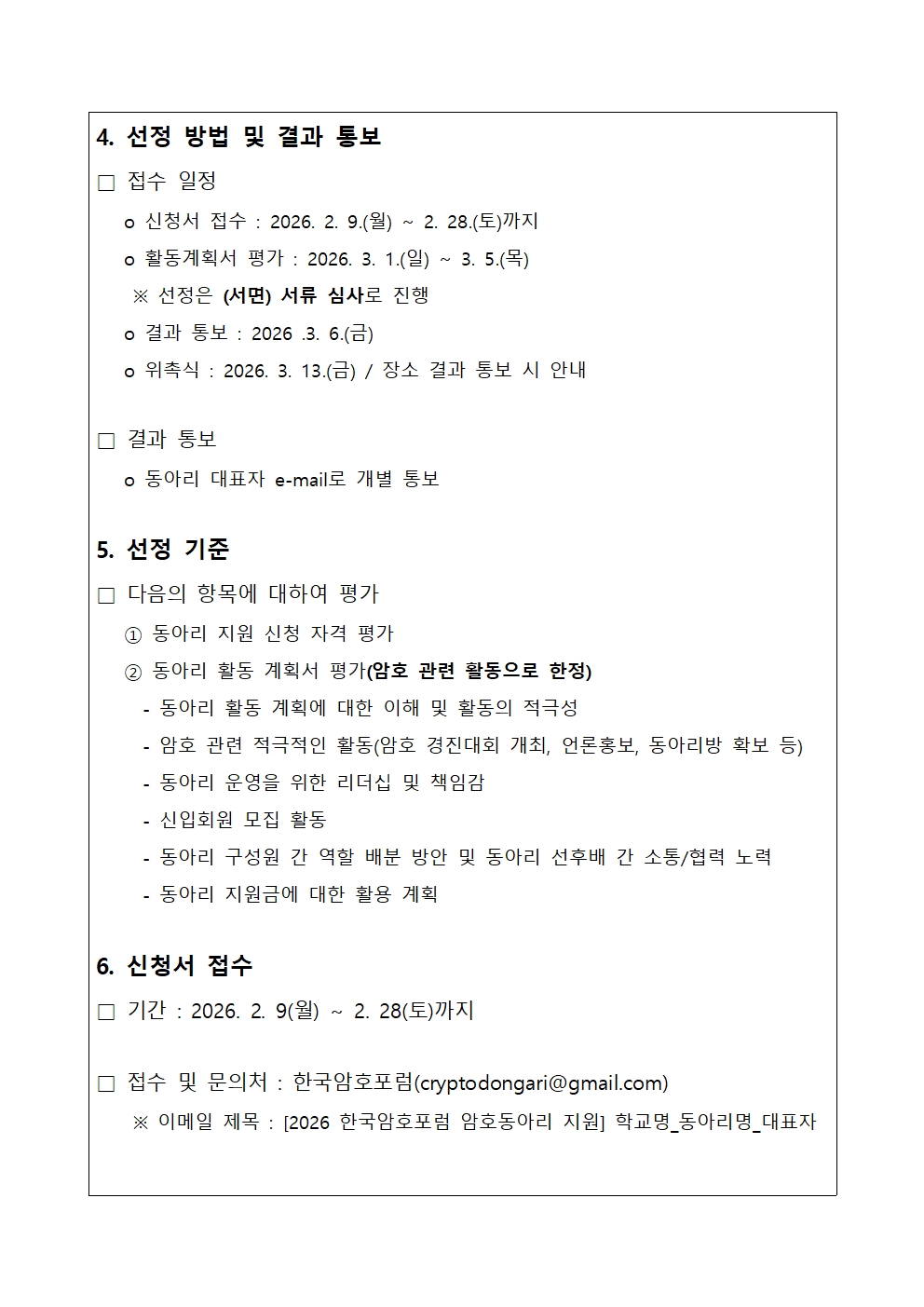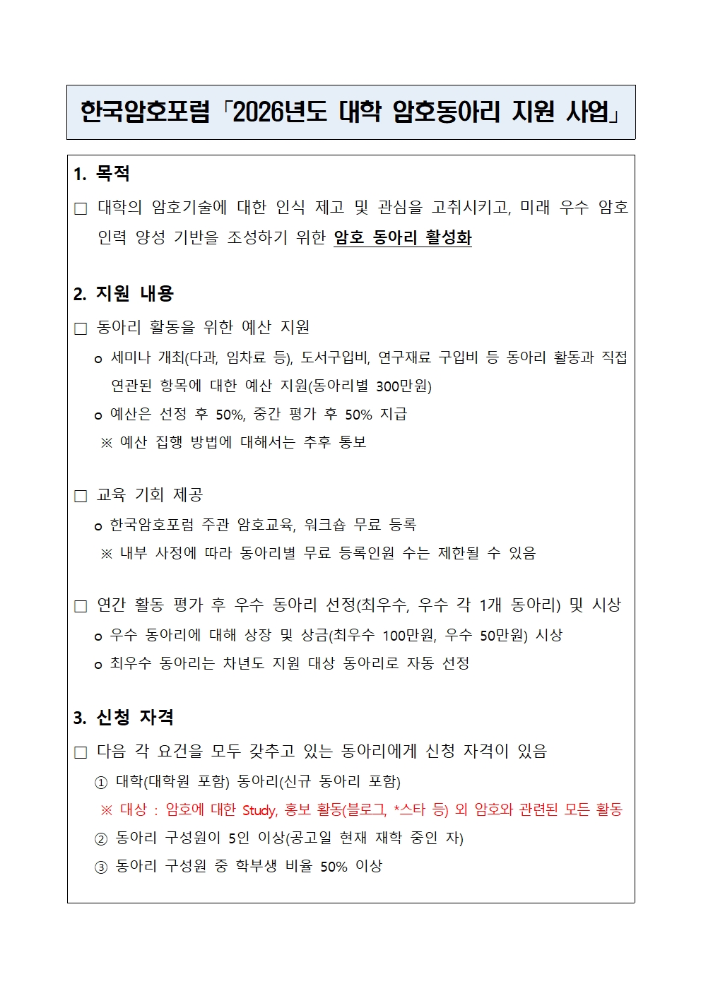 한국암호포럼에서는 미래 우수 암호연구 인력양성을 위해 "2026 대학 암호동아리 지원사업"을 진행합니다.