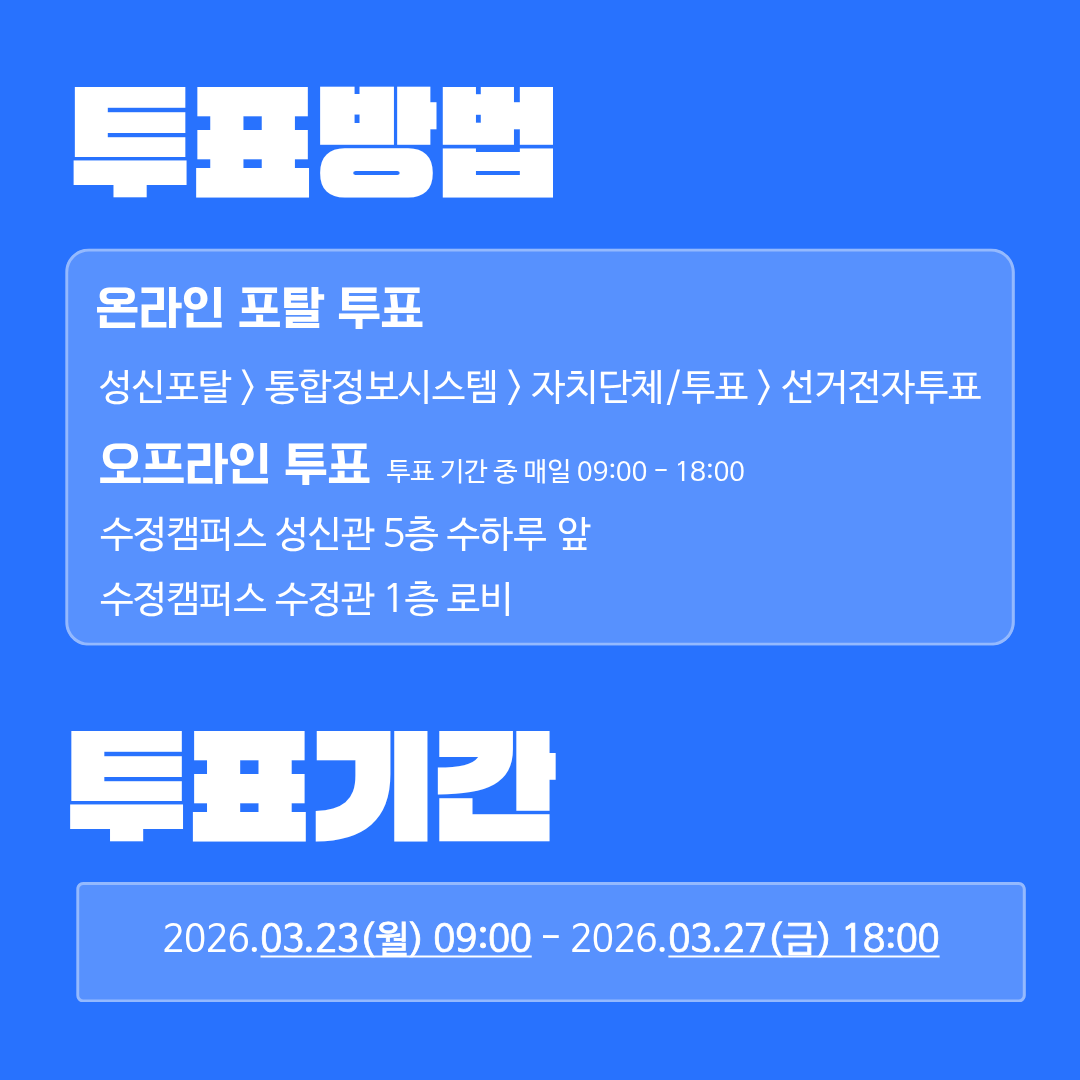 오프라인 투표: 투표기간 중 매일 09:00 ~ 18:00 (수정캠퍼스 성신관 5층 수하루 앞, 수정캠퍼스 수정관 1층 로비)