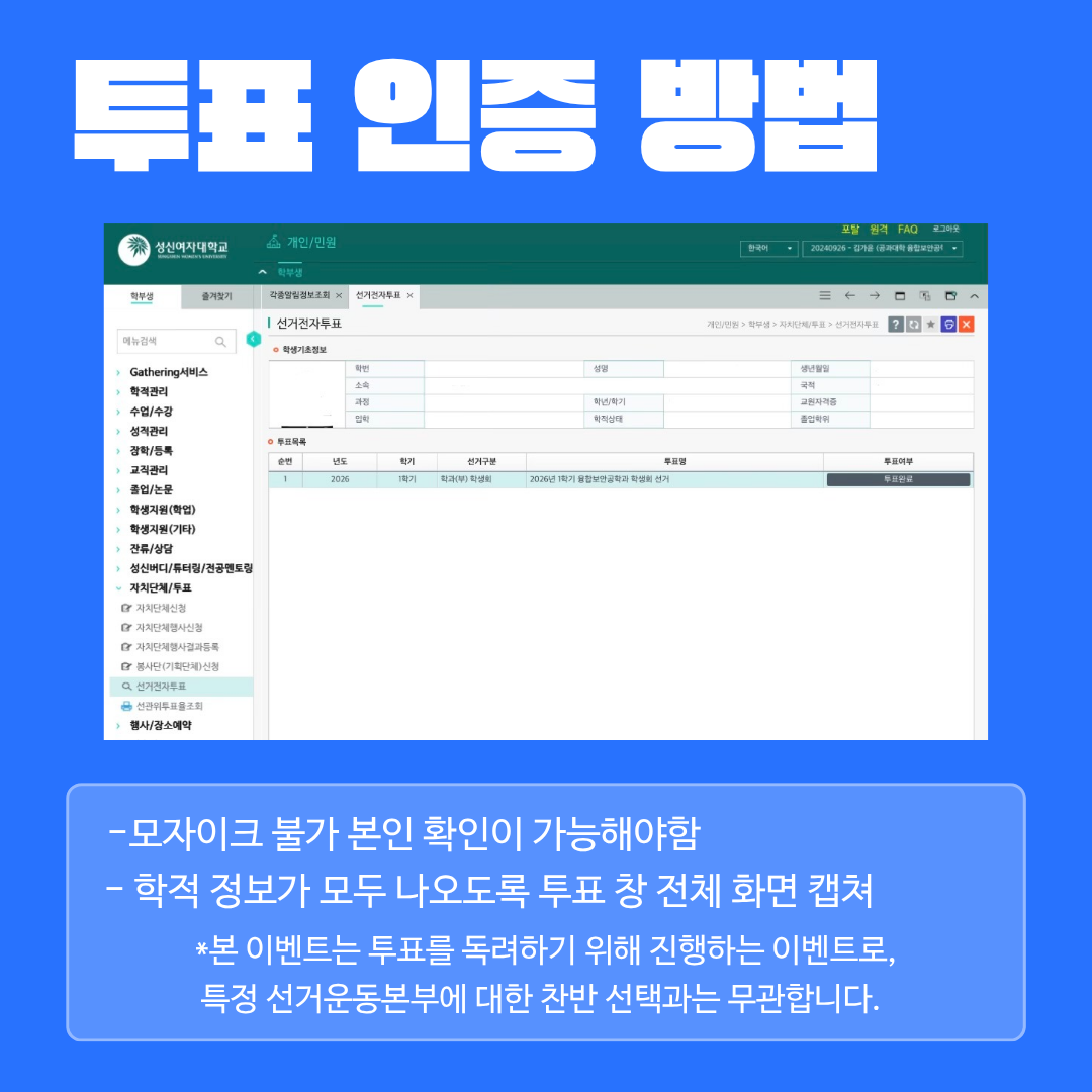 - 투표 인증 방법: 모자이크 불가 (본인 확인 가능해야 함), 학적 정보가 포함된 투표 화면 전체 캡처