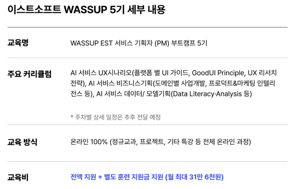 AI 서비스 기획자 양성과정 : [ESTsoft] WASSUP EST AI서비스 기획자 양성과정 5기 모집 (~8/31 마감) (greetinghr.com)