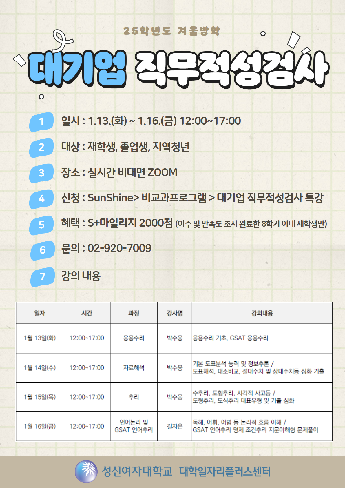 [대학일자리플러스센터] 2025년 겨울방학 대기업 직무적성검사 특강 안내