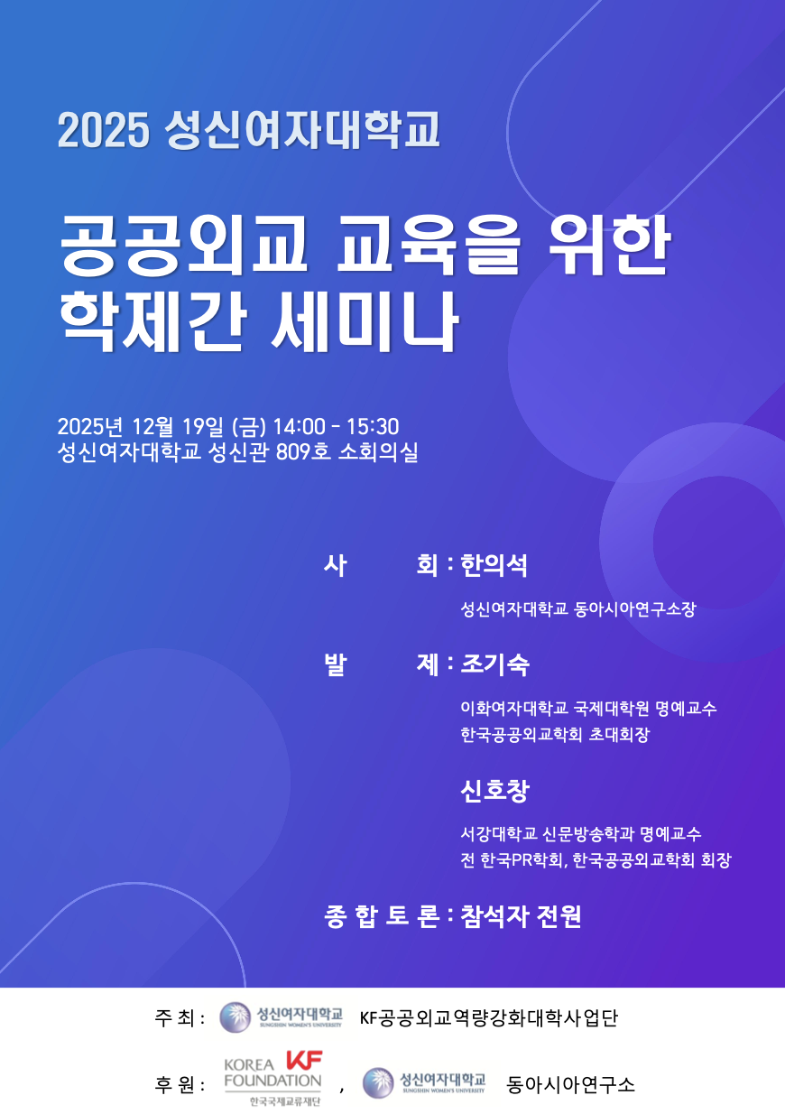 오는 12월 19일 금요일 성신여자대학교 동아시아연구소에서 공공외교 교육을 위한 학제간 세미나를 개최합니다.