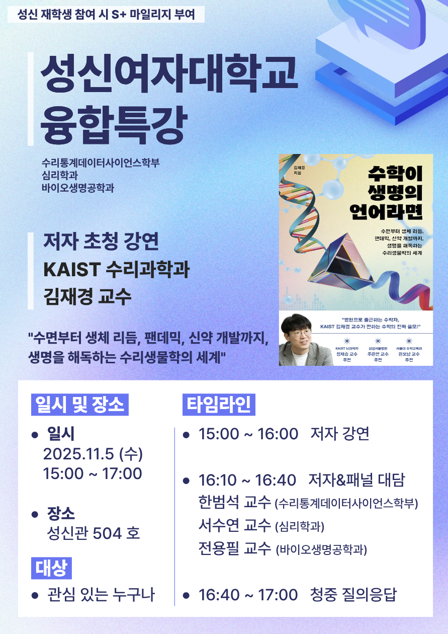 수리통계데이터사이언스학부에서 성신여대 재학생 누구나 참여 가능한 '융합특강' 을 비교과 프로그램으로 진행 예정임에 따라 안내드리오니, 참여를 희망하실 경우 아래의 이미지를 참고하여 주시기 바랍니다.