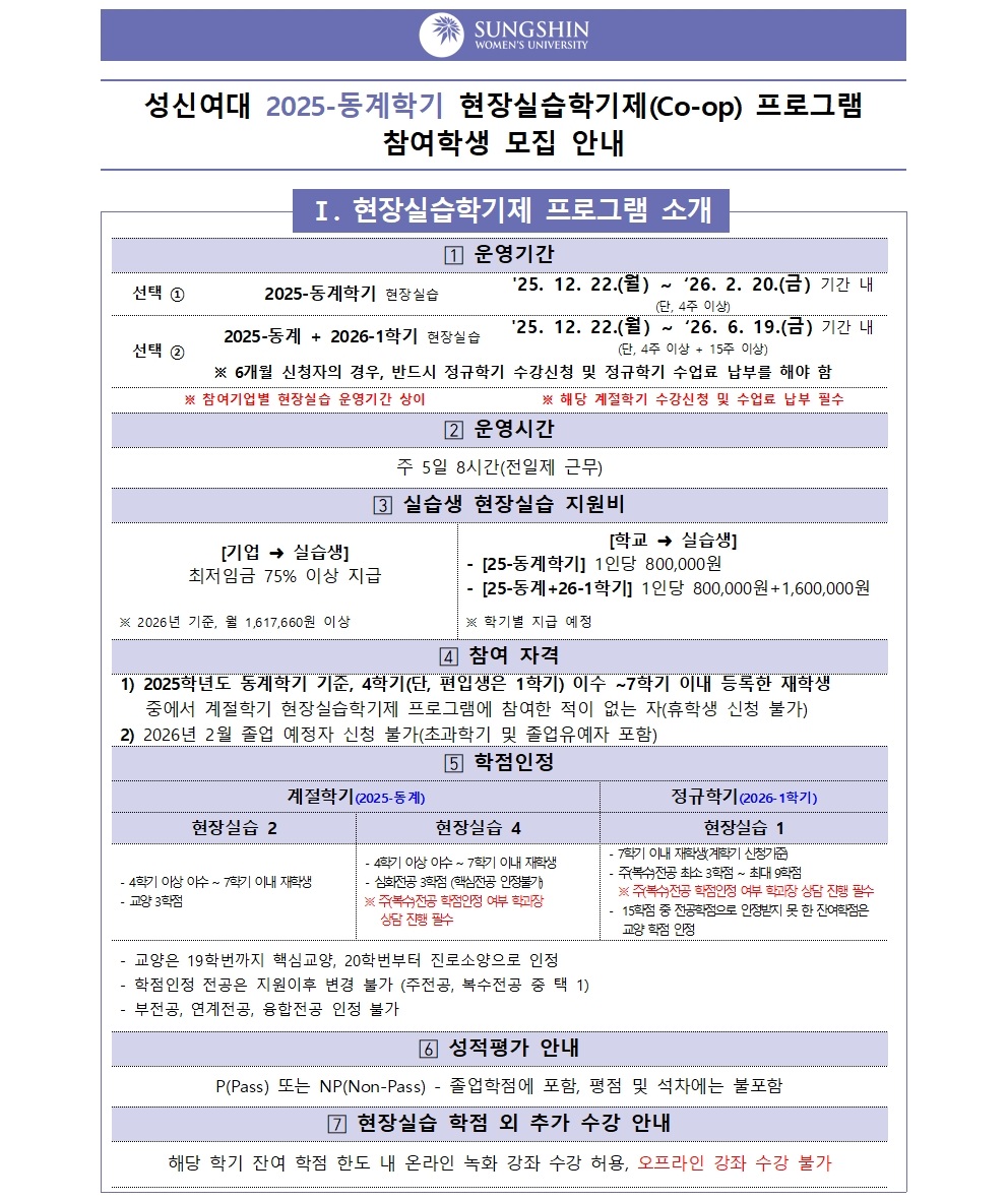 [진로취업처] 2025-동계 현장실습학기제(Co-op) 참여학생 모집 안내