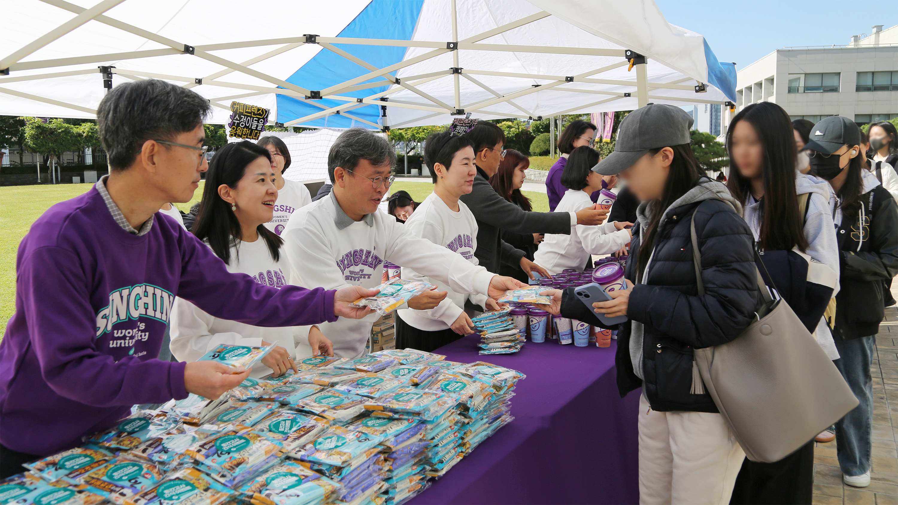 이날 행사에는 양 캠퍼스에서 총 1,100명(수정캠퍼스 700명, 운정그린캠퍼스 400명)의 재학생이 참여해 활기를 더했으며 성신여대 이원호 교학부총장을 비롯한 처장단과 <커피 프렌즈 기부>에 참여한 기부자 12명이 직접 현장을 찾아 학생들에게 학생지원팀과 대외협력홍보팀에서 함께 준비한 중간고사 응원 커피 음료와 간식을 전달하며 응원의 마음을 전했다.