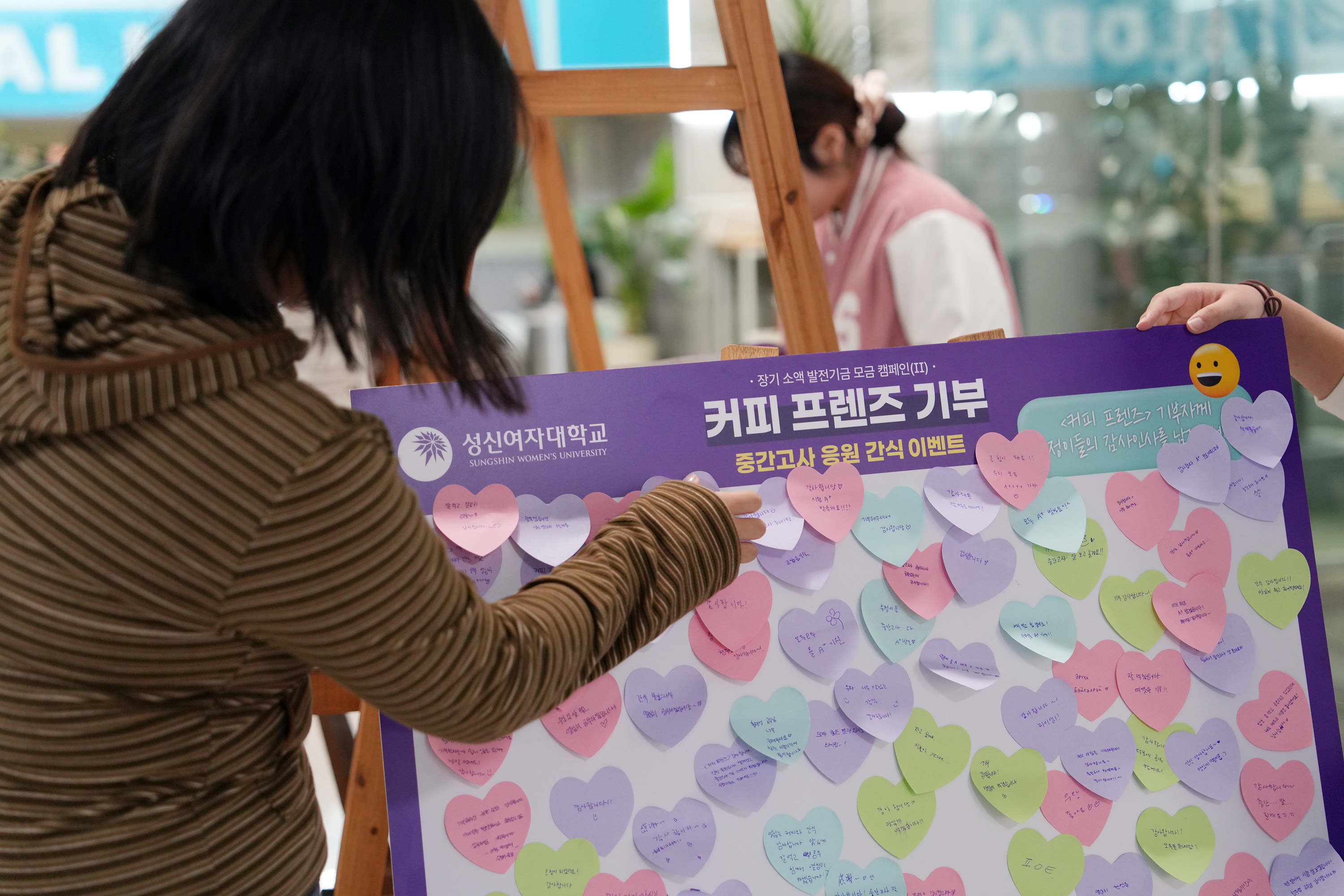 성신여자대학교(총장 이성근)는 10월 22일(수), 중간고사 기간을 맞아 커피 프렌즈 기부자와 함께하는 <중간고사 응원 이벤트>를 수정캠퍼스(성신관 앞 잔디운동장)와 운정그린캠퍼스(지하 1층 글로벌라운지 앞)에서 각각 개최했다.
