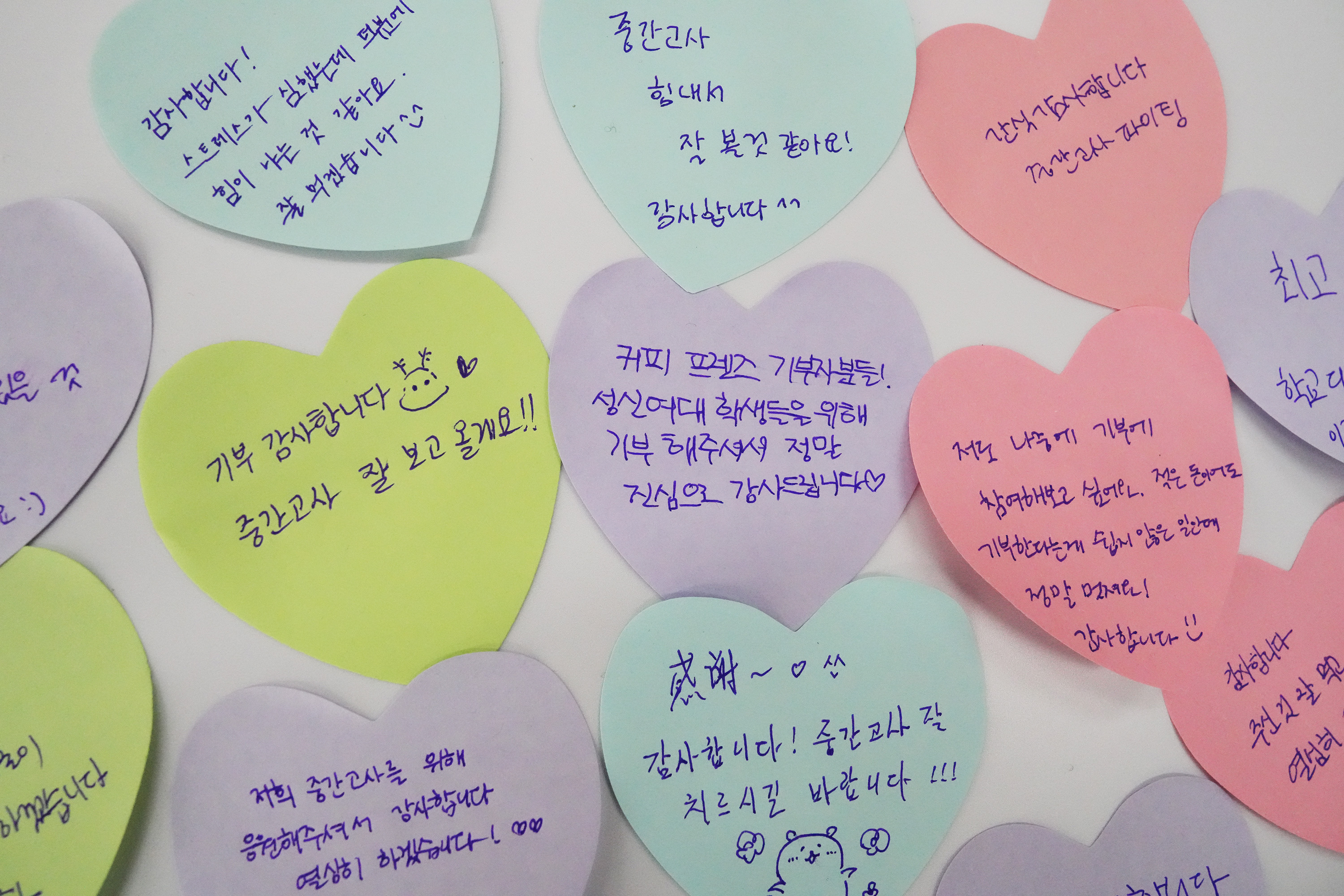 이벤트에 참여한 재학생들은 “<커피 프렌즈 기부> 기부자분들께서 직접 중간고사를 응원해 주시고 커피와 간식도 주셔서 정말 힘이 났다”며 “남은 시간 동안 더 열심히 공부해서 좋은 성적으로 보답하고 싶다”고 기부자에게 감사 메시지를 남겼다.