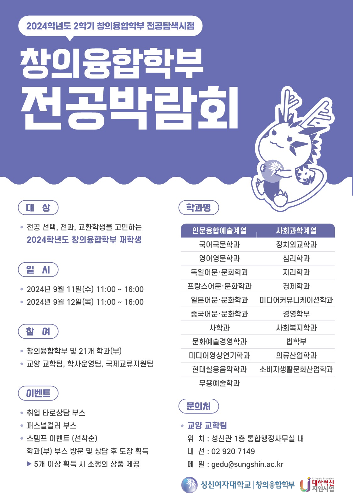 2024학년도 2학기 창의융합학부 전공 박람회 일정을 공지합니다.