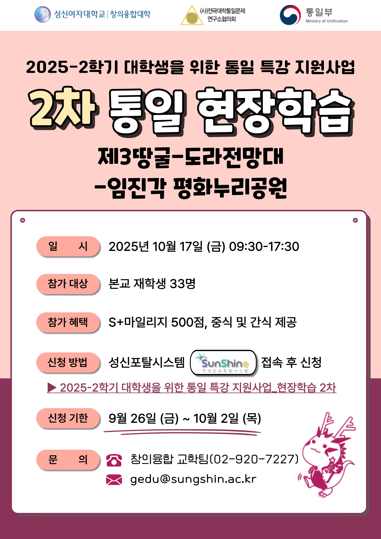 창의융합대학이 주관하는 2025-2학기 대학생을 위한 통일 특강 지원사업에서 10월 17일, 본교 재학생을 대상으로 통일 현장학습을 진행합니다.
