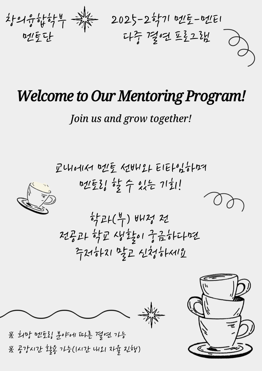 ▶신청링크: 2025-2학기 창의융합학부 멘토-멘티 다중 결연 프로그램 참여 멘티 모집 - Google Forms