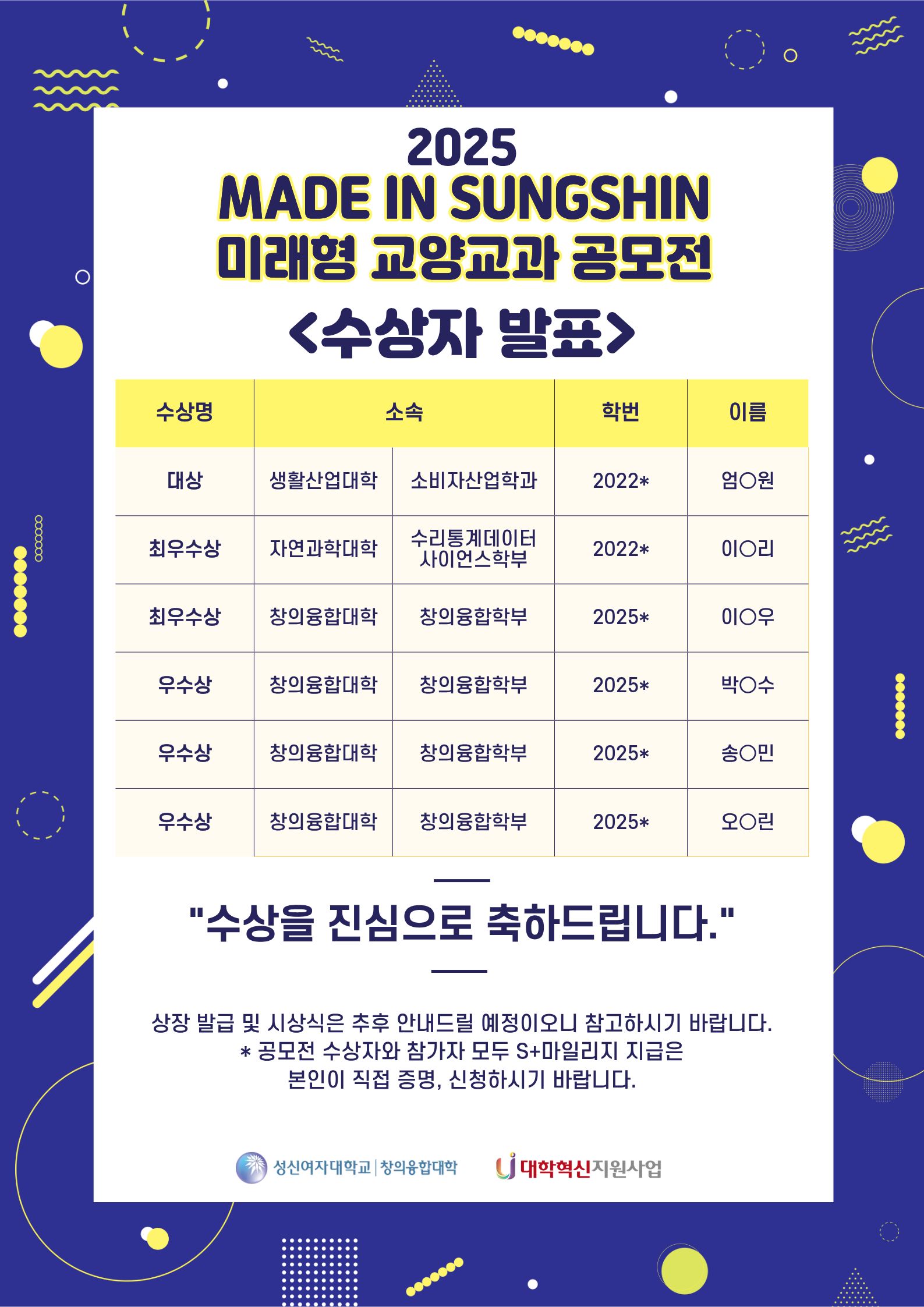 2025 MADE IN SUNGSHIN 미래형 교양교과 공모전 수상자 발표