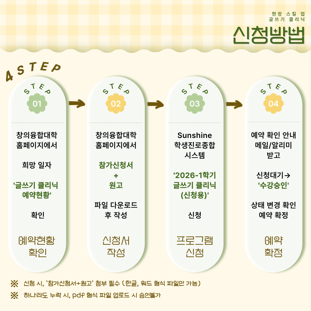 ▶ 신청 접수: 포탈 로그인 → SunShine(선샤인) 접속 → '2026-1학기 글쓰기 클리닉 (신청용)' 신청