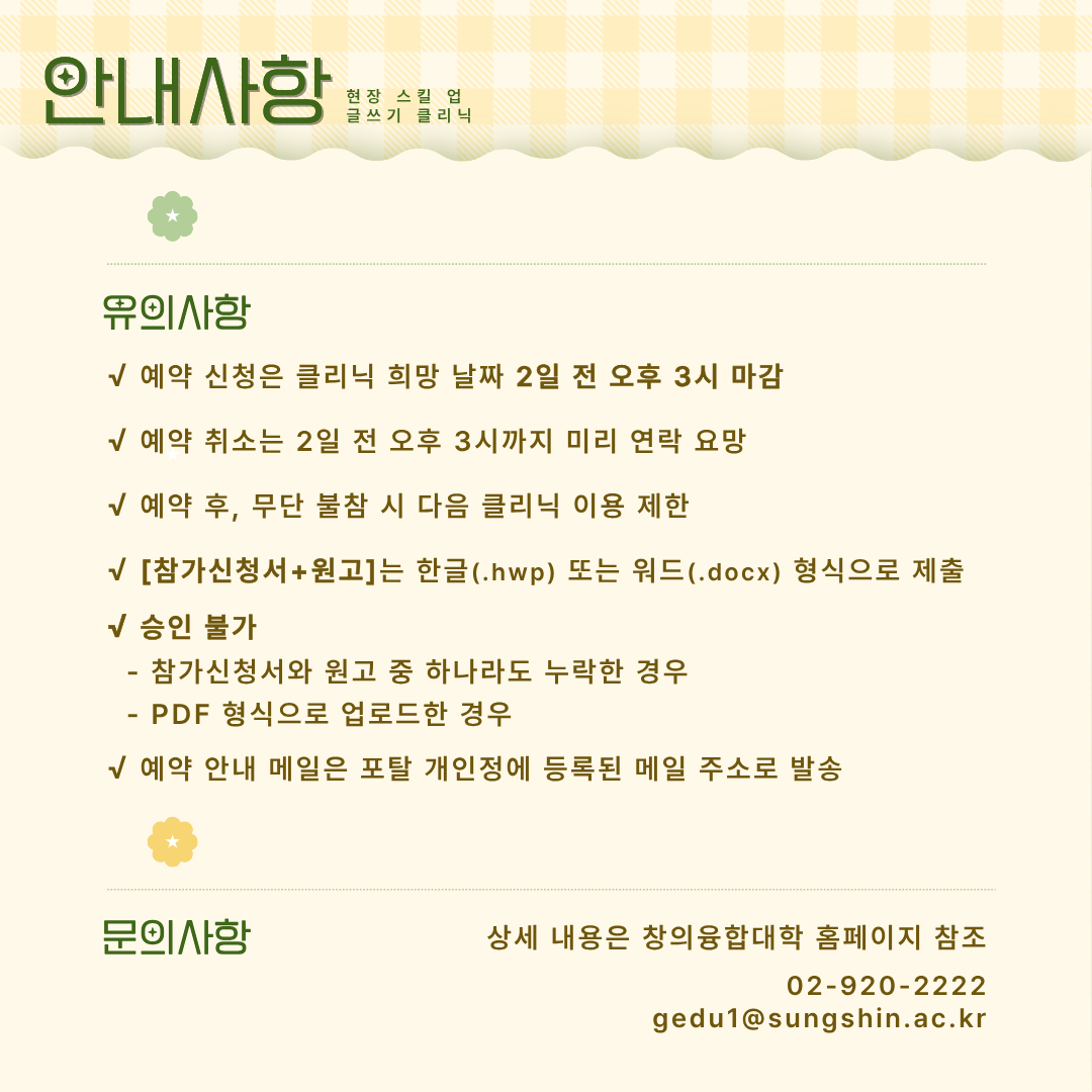 ▶ 무단 불참(NO-SHOW): 신청 승인 후 당일 취소나 무단 불참 시, 해당 학기 클리닉 신청이 영구 제한됩니다.