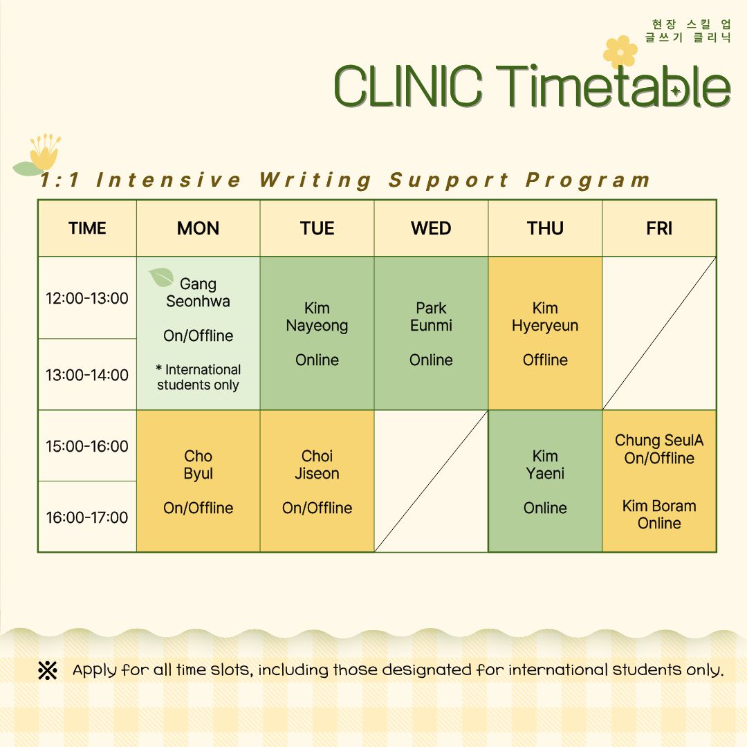 월요일, 화요일 클리닉 희망자는 직전 주 금요일 오후 3시까지 모든 신청과 서류 첨부를 마쳐야 합니다!
