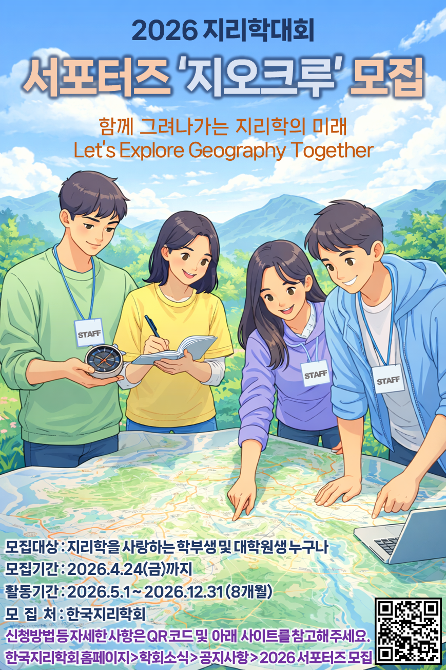 지리학의 가치를 알리고, 학술대회의 생생한 현장을 함께 만들어 갈 2026 한국지리학회 서포터즈 ‘지오크루’를 모집합니다. 지리학을 사랑하는 학과 학부생 및 대학원생 여러분의 많은 관심과 지원 바랍니다.