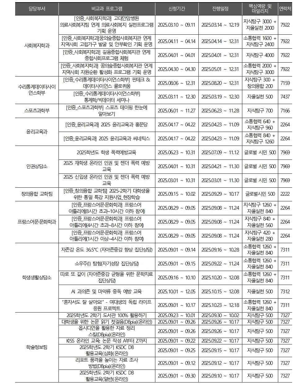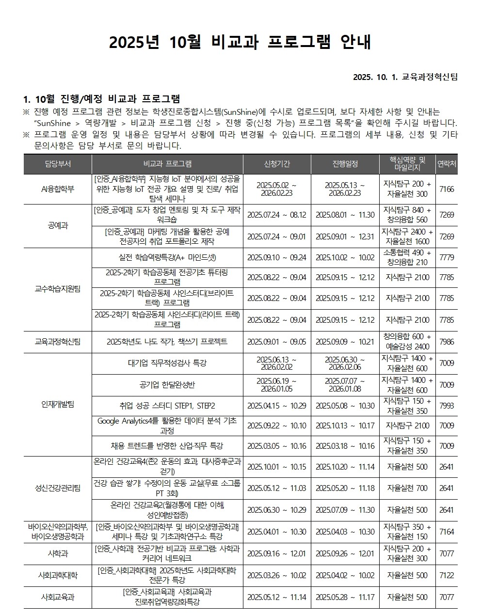교육과정혁신팀에서는 재학생 여러분이 우리 대학 인재상에 부합하는 인재로 성장하는데 필요한 성신핵심역량을 개발하고 강화할 수 있도록 비교과 교육과정을 체계화하고 통합 관리하고 있습니다. 2025년 10월 비교과 프로그램을 다음과 같이 공지합니다. 재학생 여러분의 적극적인 관심과 참여를 부탁드립니다.