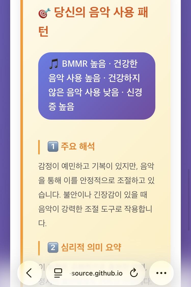 프로그램의 핵심 활동 중 하나였던 ‘음악 심리 척도 측정’은 음악을 통한 감정 조절과 성격 성향을 측정한다. 감정 예민도, 음악 활용 목적, 정서 조절 방식 등을 수치화해 시각적으로 보여준다. 참가자들은 이를 통해 자신의 감정 민감성과 음악 사용 패턴을 구체적으로 파악할 수 있었다.