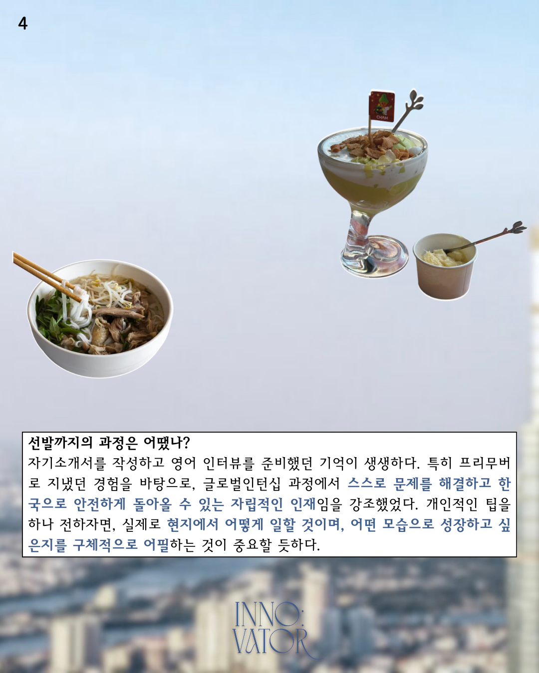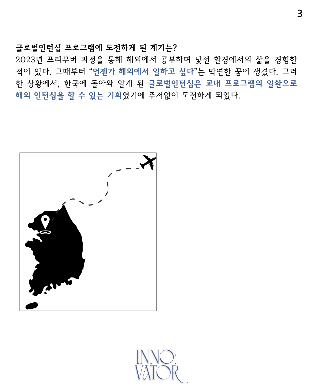 A. “2023년 프리무버로 해외에서 공부하고 온 후 저는 “해외에서 일하고 싶다.”라는 막연한 꿈을 가지게 되었습니다. 그러던 중 교내 프로그램으로 해외 인턴십을 할 수 있는 기회가 있어, 글로벌 인턴십 프로그램에 도전하게 되었습니다.”