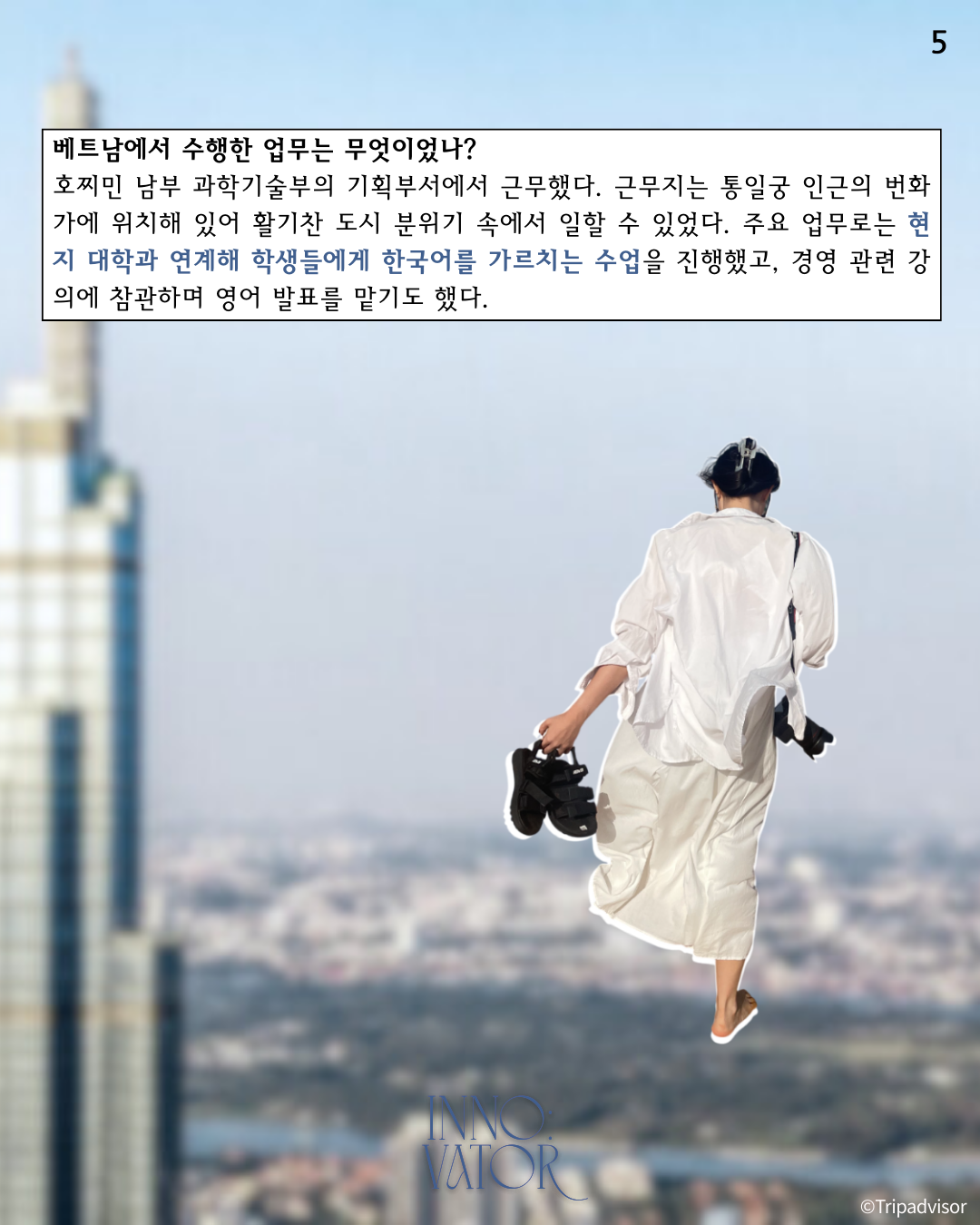 A. “당시 생활은 너무 재밌었고 다시 돌아봐도 즐거운 추억으로 남아 있습니다. 저는 성신여자대학교에서 같이 파견 갔던 친구들과 하우스 메이트로 살았었는데 좋은 친구들과 함께해서 그런가 더 재밌고 값진 시간이었던 것 같습니다. 저는 인턴 근무를 쉬는 주말, 매주 하우스 메이트 친구들과 베트남 지역 방방곡곡을 여행 다녔었는데요. 푸꾸옥, 나쨩 등 일도 하고 여행도 하며 보냈던 시간은 한국에서의 생활이 힘들 때 삶을 살아가게 해주는 원동력이 되곤 했습니다.”